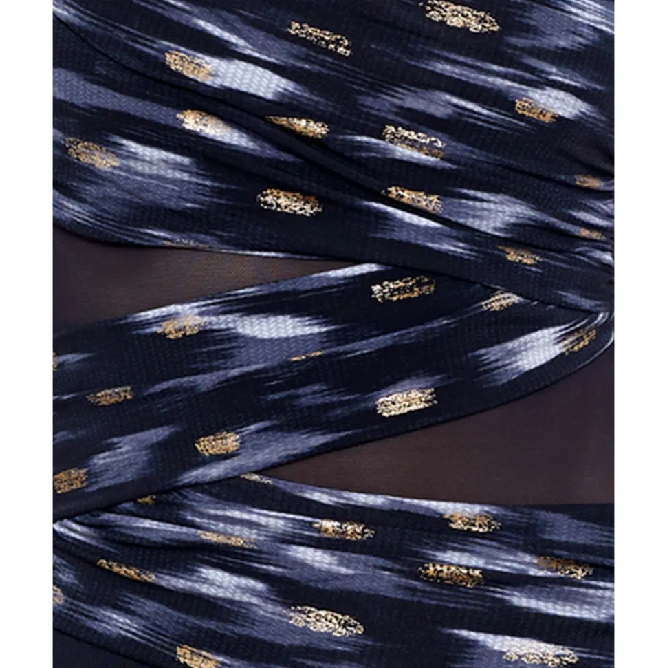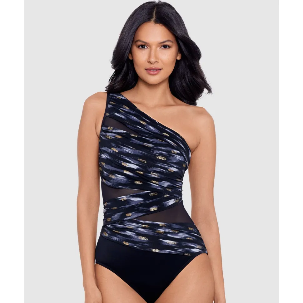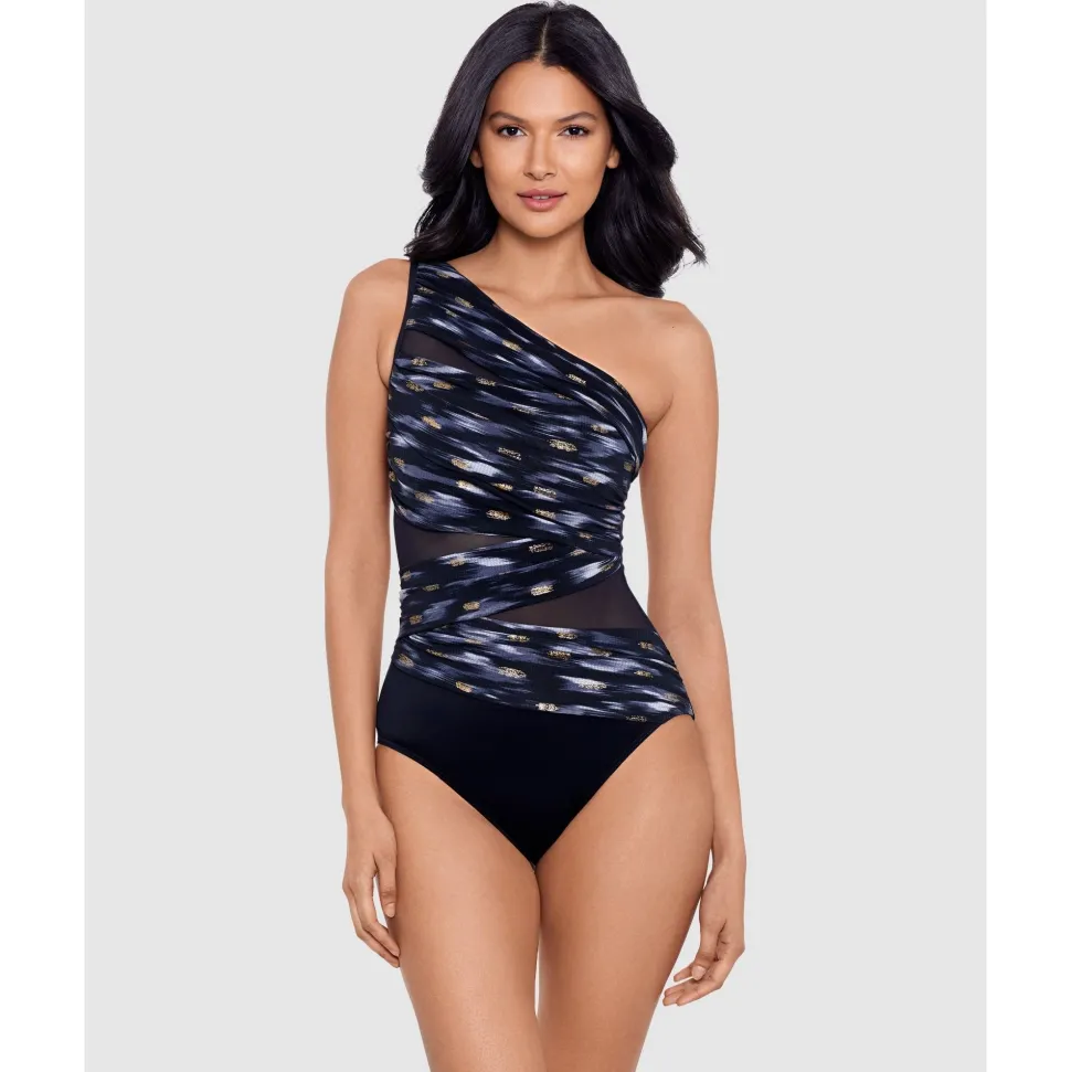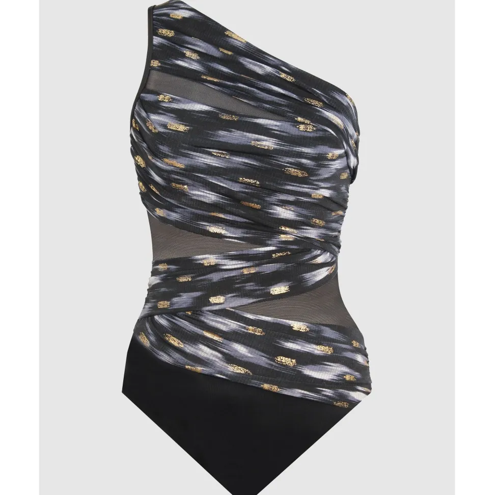 Sophisticated styling meets flattering shaping in this asymmetric swimsuit design, which dramatically slims your figure through a combination of shapewear-effect fabric and illusion draping and panelling. Ruched fabric criss-crosses over a mesh background, revealing hints of sheerness, while the solid back creates a slender-looking figure from every angle.