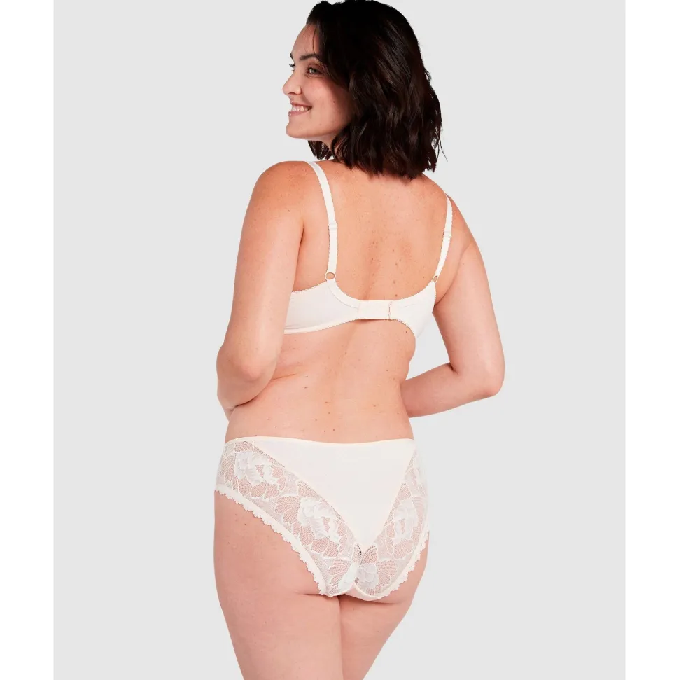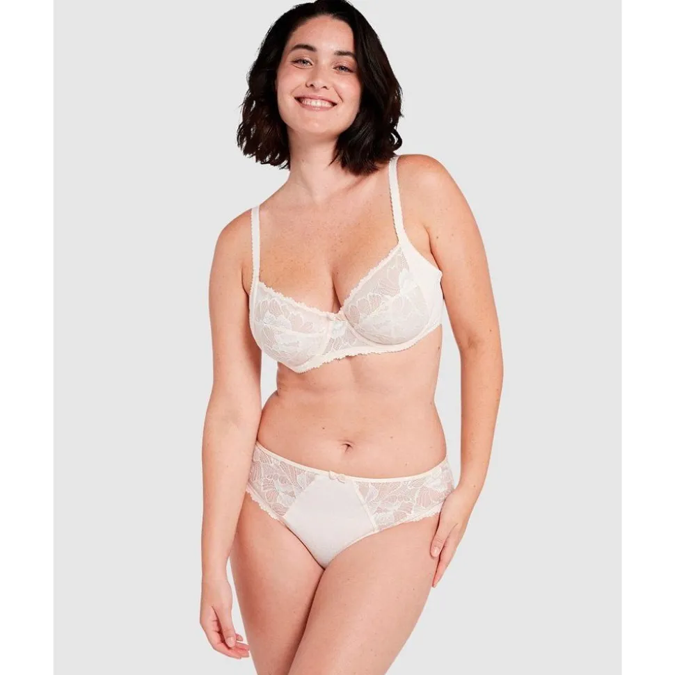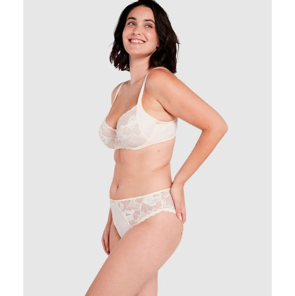 Yes, you really can have it all: a stunningly beautiful lace bra that offers fabulous (and comfortable) support all the way up to an F cup! The seamed, 4-part cups are made from a two-tone floral lace that’s lined with supportive tulle, while the outer cup panels and band are crafted from a subtly-patterned and textured microfibre.