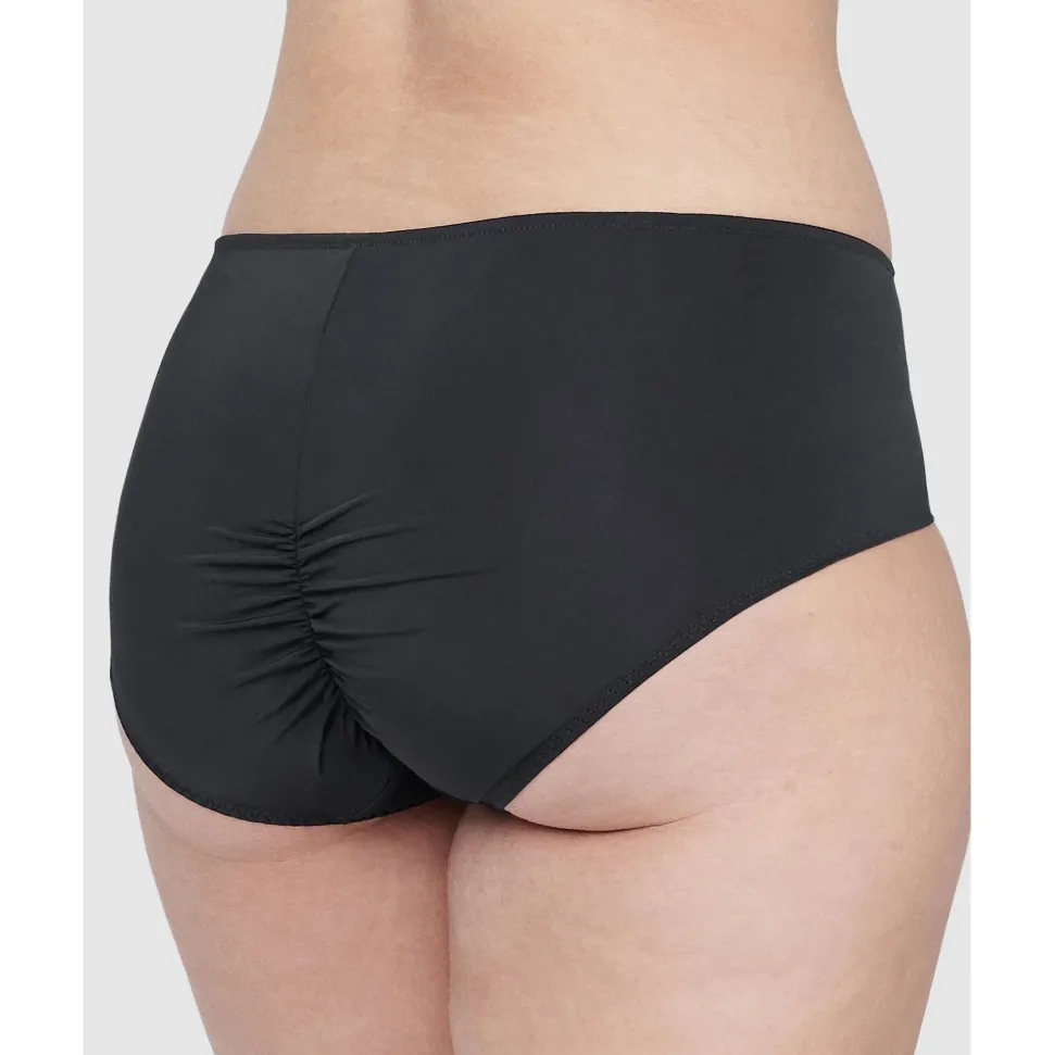 Everyday comfort meets sexy styling in this boyshort-fit brief, which features a panel of sheer lace at the front with an eyelash trim. At the back, a centre seam and ruching detail accentuate your curves while still providing a full coverage fit.