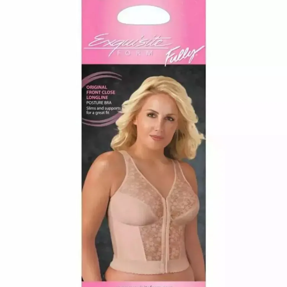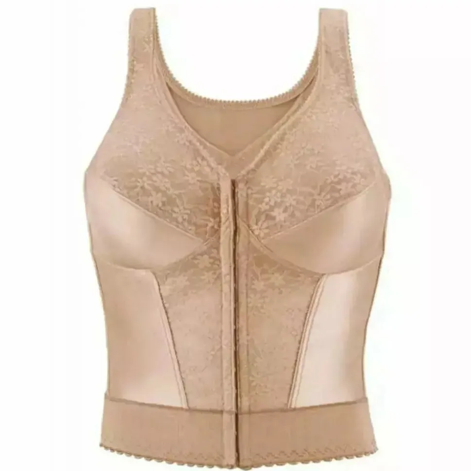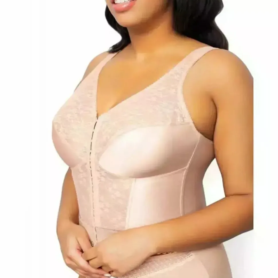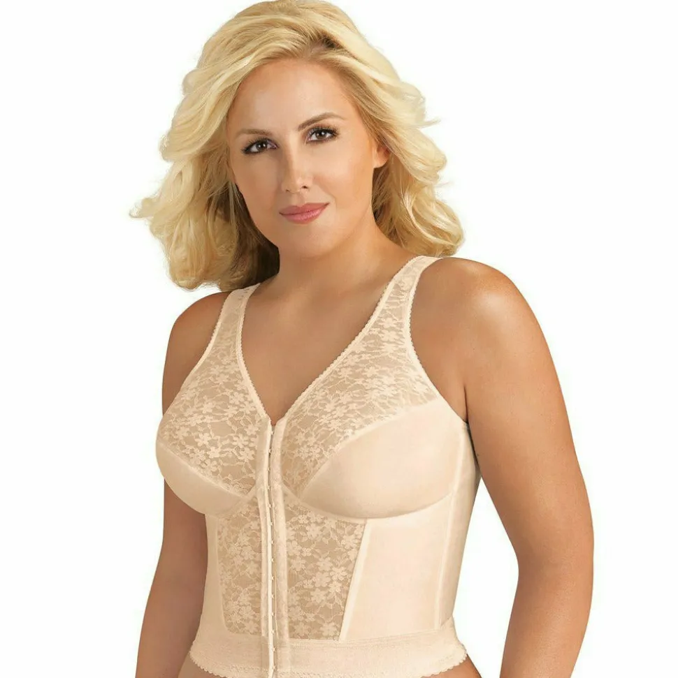 This extra-longline bra provides full support, posture control, tummy shaping, and a chic retro-glam look all in one! It’s a plus size, waist-length bra with a hook-and-eye front fastening (with a soft brushed interior). At the back, criss-cross elastic helps to improve your posture, and the design also provides a completely smooth look under your clothing. This wireless bustier bra is made from a combination of powermesh, satin-finish fabric and sheer, breathable lace, and has flexible boning at the sides for added support and shaping.