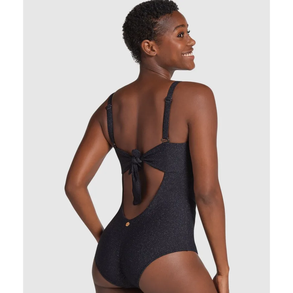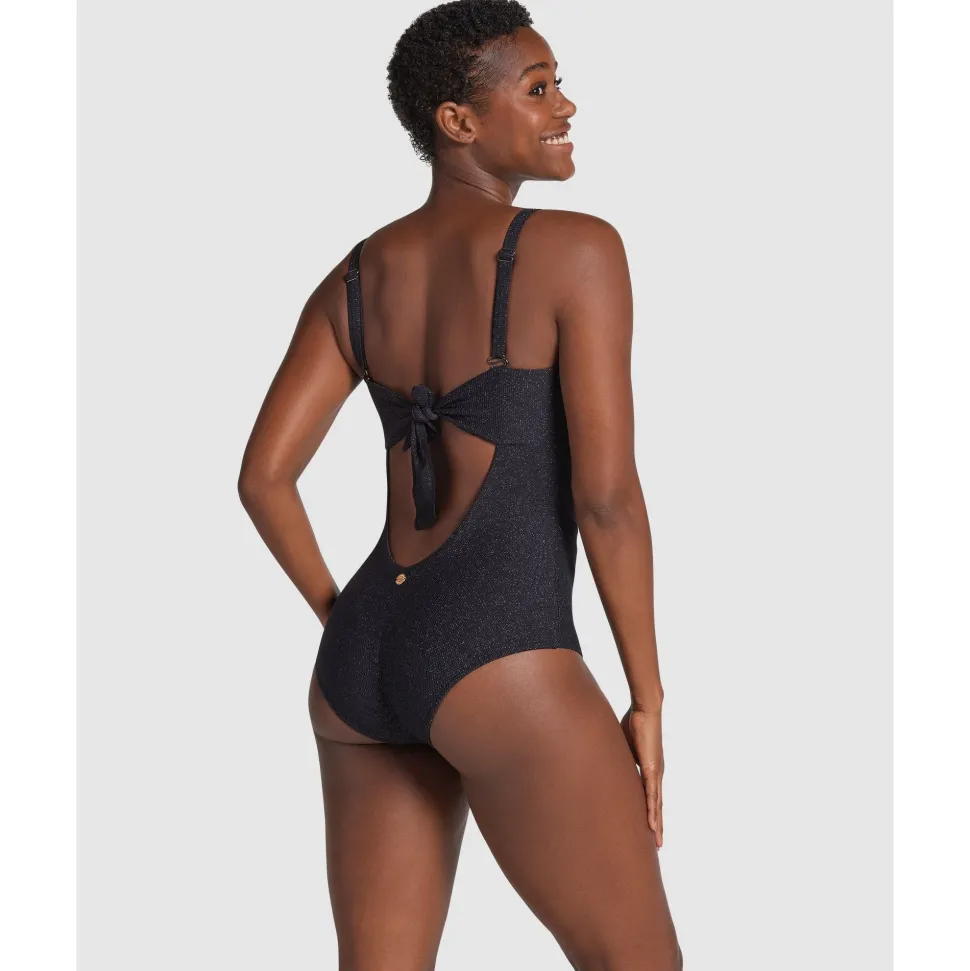 Whether you wear it as swimwear or as a statement-making bodysuit, you’re sure to turn heads in this glittery swimsuit with mesh chevron details and an open back, decorated with a chic tie detail and metallic charm. It’s a chlorine-resistant swimsuit that delivers light tummy control, and features light foam padding to also contour your bust.