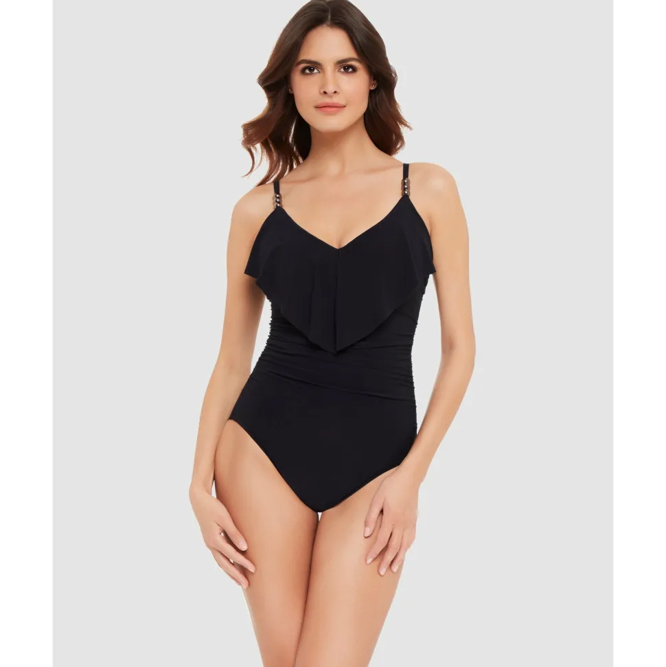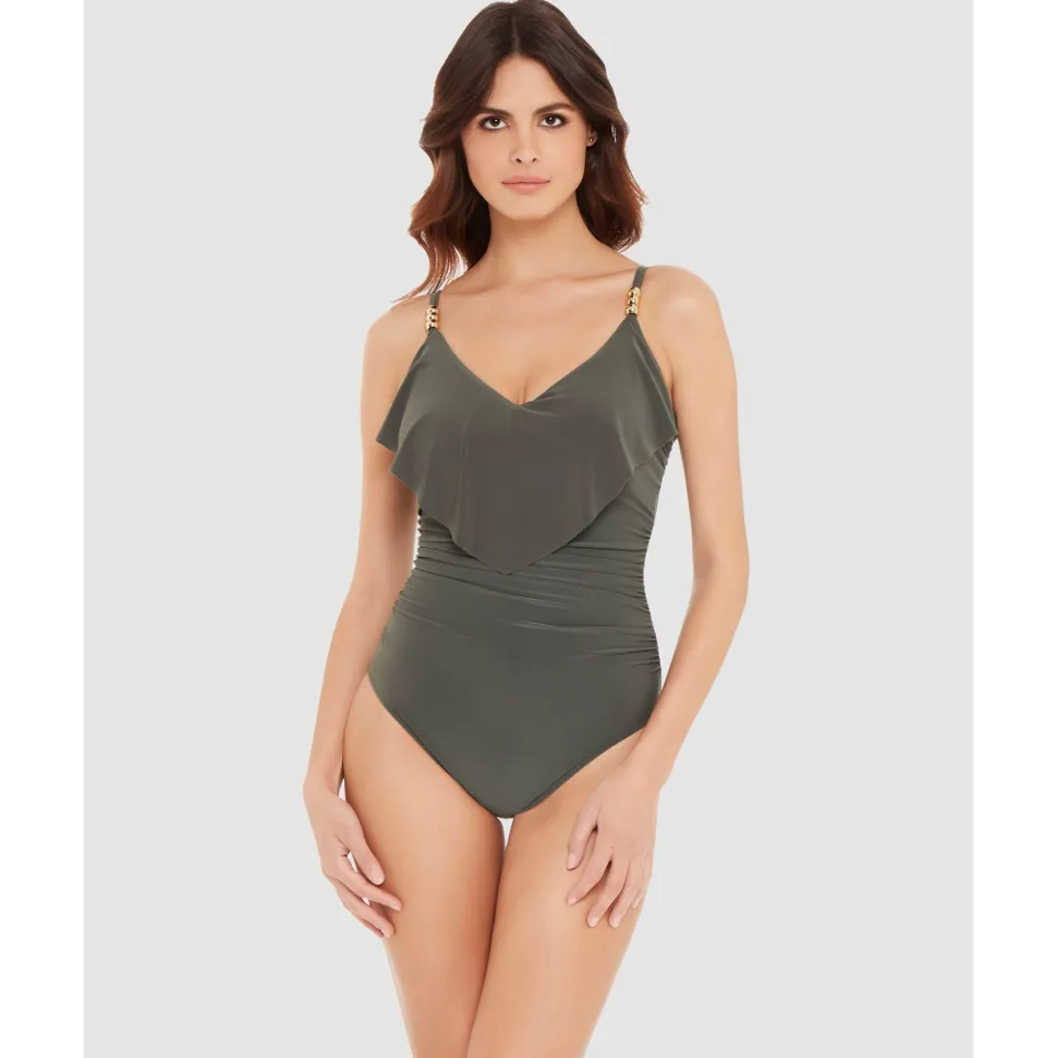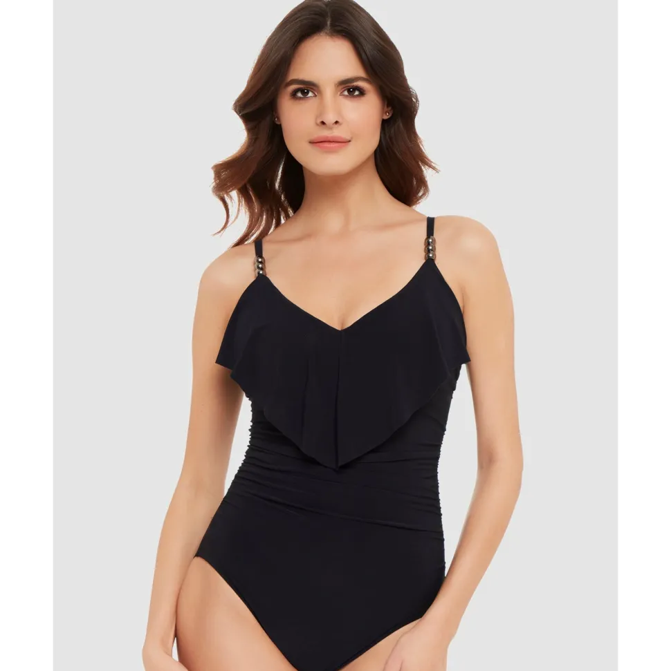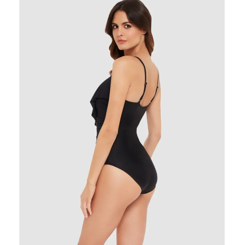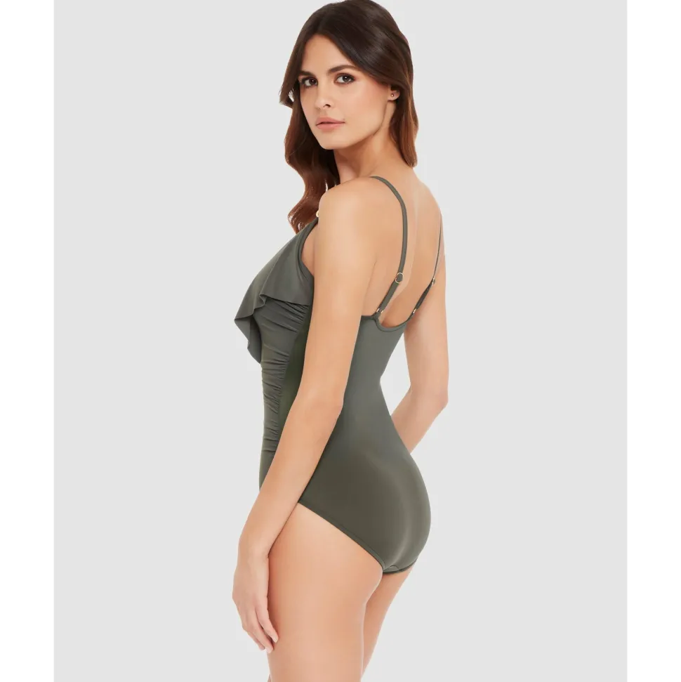 Cut a sleek figure in the water with this tummy control swimwear, made with firm-fitting fabric to smooth and shape plus LYCRA® XTRA LIFE™ spandex for a comfortable, long-lasting fit. Below the higher-set neckline are supportive underwired cups with removable padding, covered by a wide flounce of draped fabric that helps to minimise a larger bust.