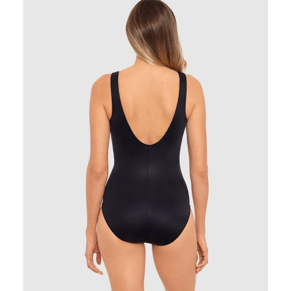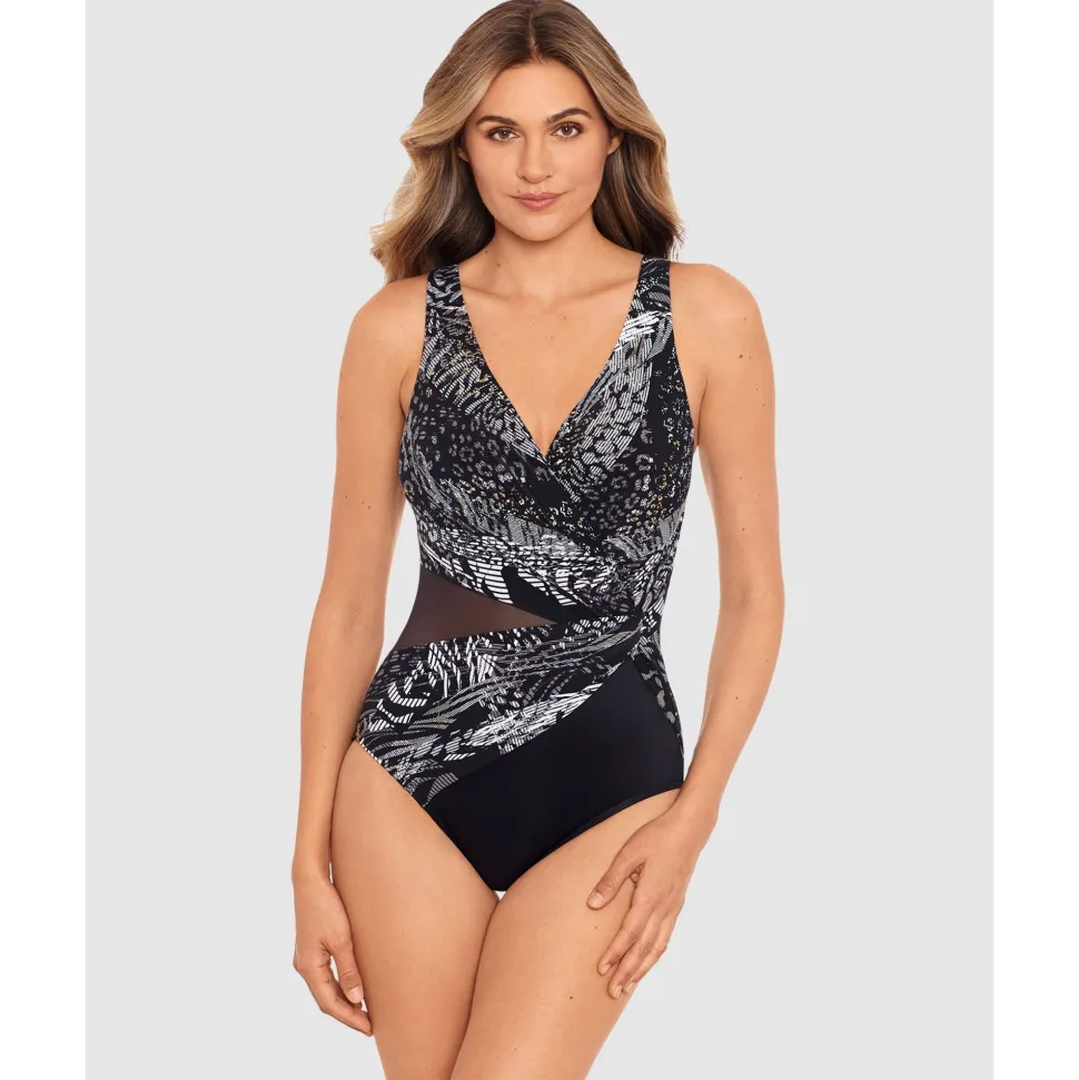 Get instant hourglass curves in this tummy-flattering one-piece swimsuit from Miraclesuit’s Illusionists collection, which combines shaping fabric with clever draping to flatter your figure. The Miratex fabric delivers powerful all-over slimming in a single layer, but it’s the triangular mesh insert and crossover design that really shine when it comes to visual shaping – culminating in a chic, twisted knot design at one side, this asymmetric swimsuit provides maximum definition to your waistline for a beautifully curvy look.