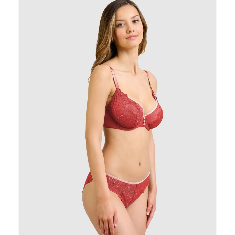 Casual comfort meets chic style in this half cup bra with lace from Miss Sans Complexe, a line of affordable and fashion-forward lingerie for fuller busts. It’s an underwired bra made from semi-transparent tulle and topped with lace, including stylish lace ‘wings’ at the back. Adorned with three satin-covered buttons between the cups.