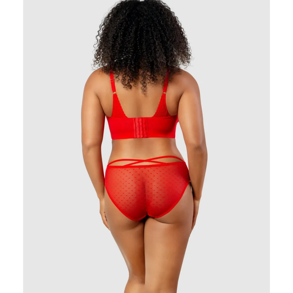 This unique lace bralette with removable padding offers you a choice of three looks to suit your mood: go subtle with tone-on-tone padding, flip the padding for a contrast colour visible through the dotted mesh, or remove it altogether for sexy sheer cups. It’s a longline bralette for enhanced support for smaller and full busts alike, and is decorated with lace trims and stylish strapping across the neckline.