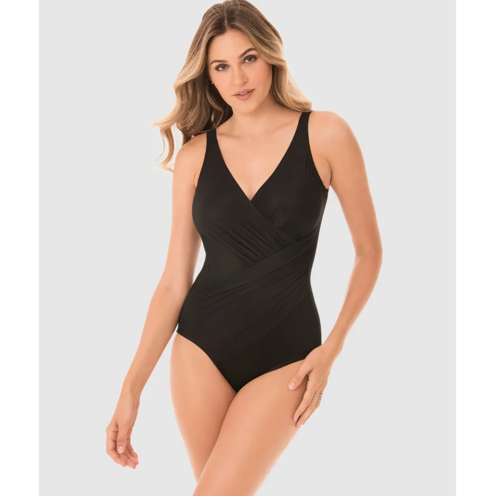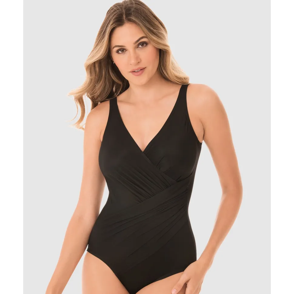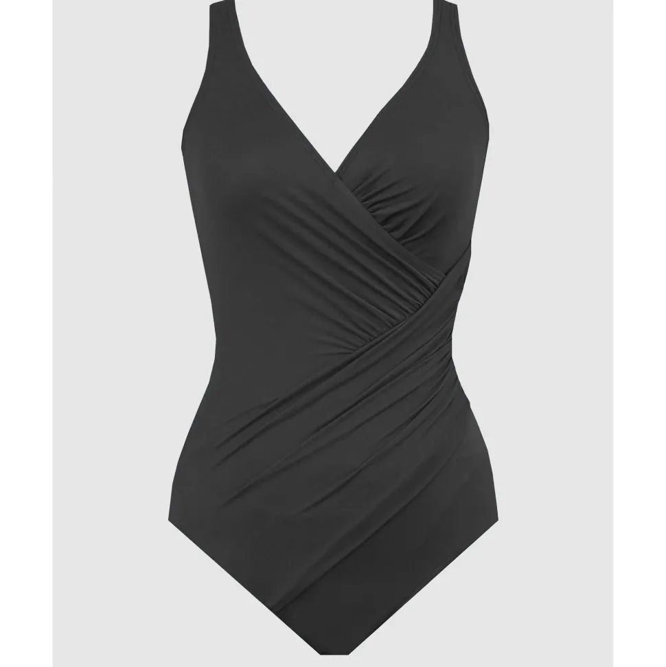 This classic, one-piece swimsuit with a crossover neckline is the perfect way to create a more hourglass-y silhouette. The wrapover front leads to subtle gathering at the side to emphasise your waistline, and this shaping swimsuit provides all-over smoothing and slimming thanks to Miraclesuit’s lightweight-yet-powerful Miratex control fabric.