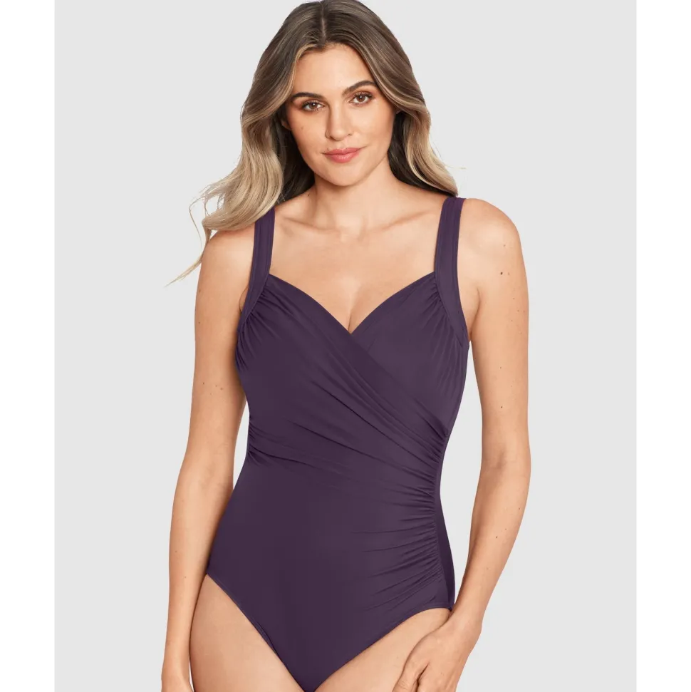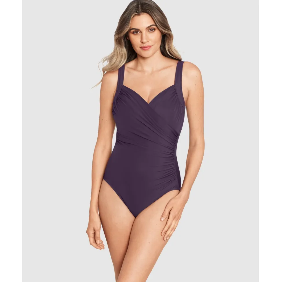 Feel fabulous at the beach in this one piece swimsuit with hidden underwire, and built-in shaping. Made from Miraclesuit’s lightweight-yet-powerful Miratex fabric, it provides all-over smoothing and slimming. Cleverly-placed ruching fans out from one side, tricking the eye into seeing a more hourglass-y silhouette. The crossover design creates a sweetheart neckline, which is framed by wide shoulder straps.