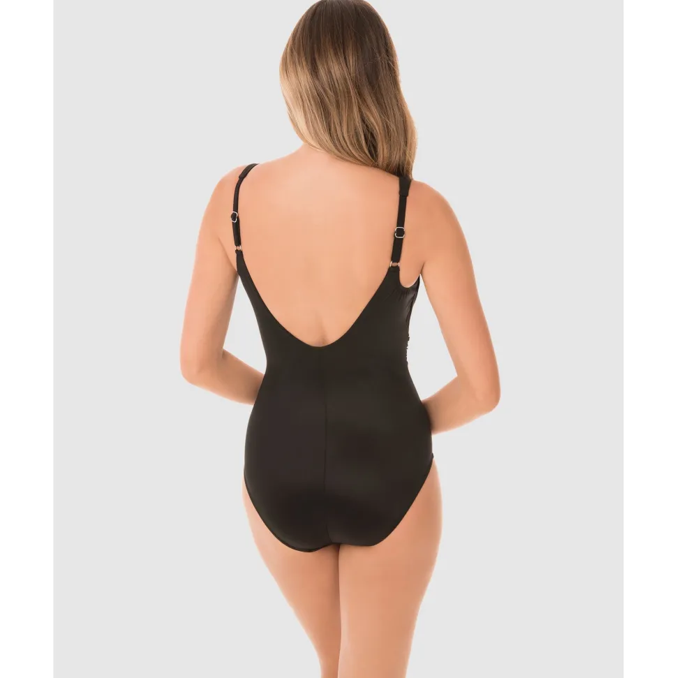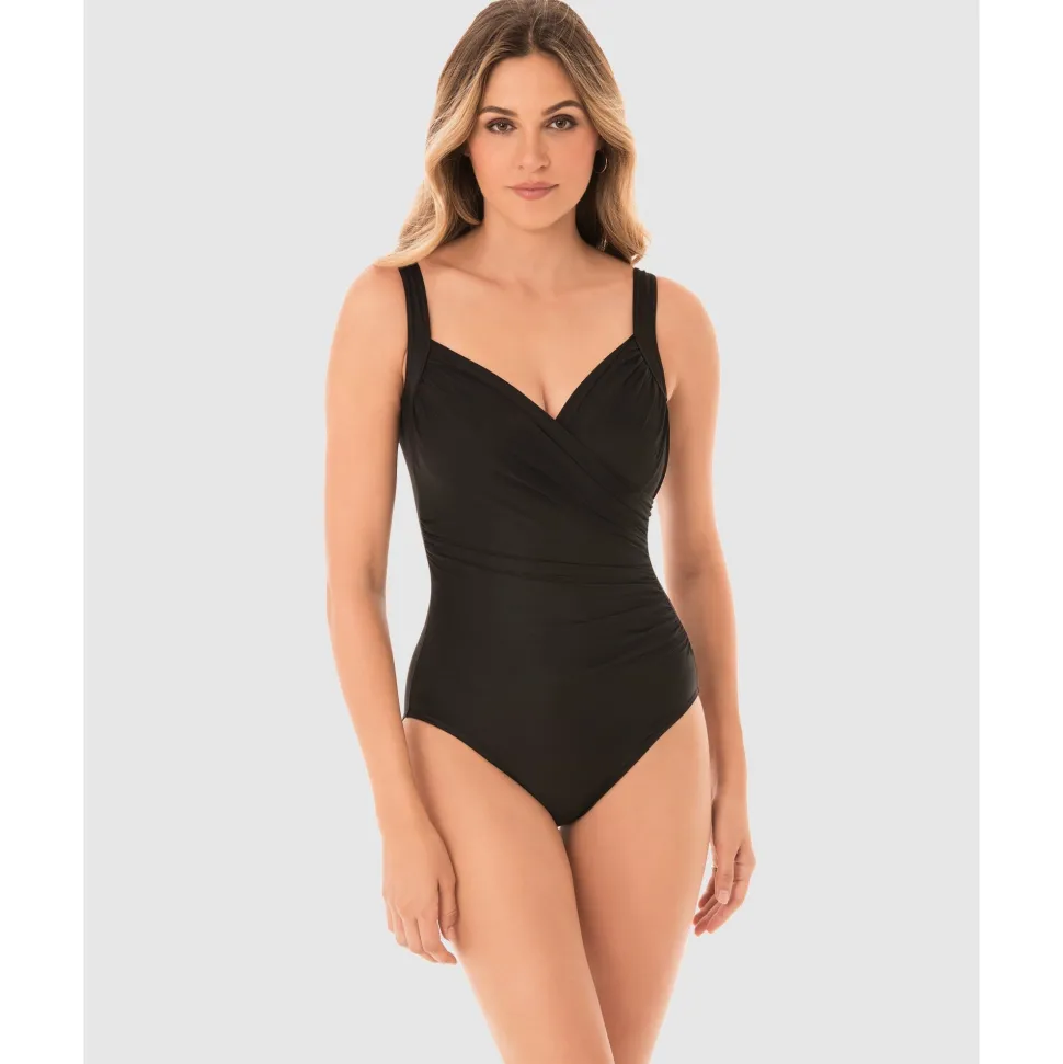 Feel fabulous at the beach in this one piece swimsuit with hidden underwire, and built-in shaping. Made from Miraclesuit’s lightweight-yet-powerful Miratex fabric, it provides all-over smoothing and slimming. Cleverly-placed ruching fans out from one side, tricking the eye into seeing a more hourglass-y silhouette. The crossover design creates a sweetheart neckline, which is framed by wide shoulder straps.