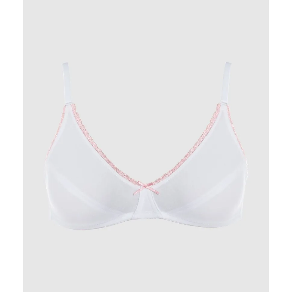 Designed to be the very first bra a girl will own, or when switching from a crop-top style training bra to one with band and cup sizing, this soft and comfy bra is made from pure cotton fabric and adorned with a narrow lace trim and ribbon bow. Available from a AA cup, the design has unlined, seamed cups, adjustable shoulder straps and an adjustable hook fastening to perfect the fit.