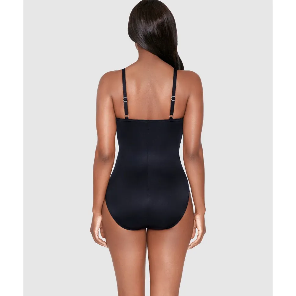 Designed especially to fit, flatter and support an E cup, this one piece swimsuit sculpts your figure with Miratex?; delivering 3x the shaping power of regular swimsuit fabrics, this firm-control material slims and smooths like no other! It’s an underwired swimsuit for secure support, and uses a clever blend of draped panelling and sheer mesh inserts to conceal your tummy while visually enhancing your curves.