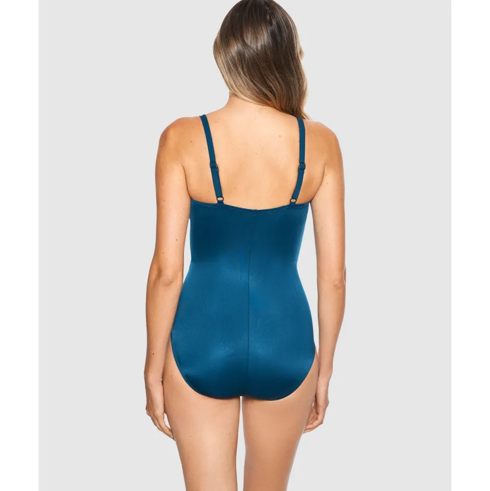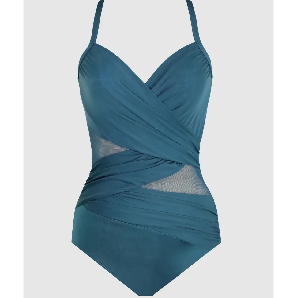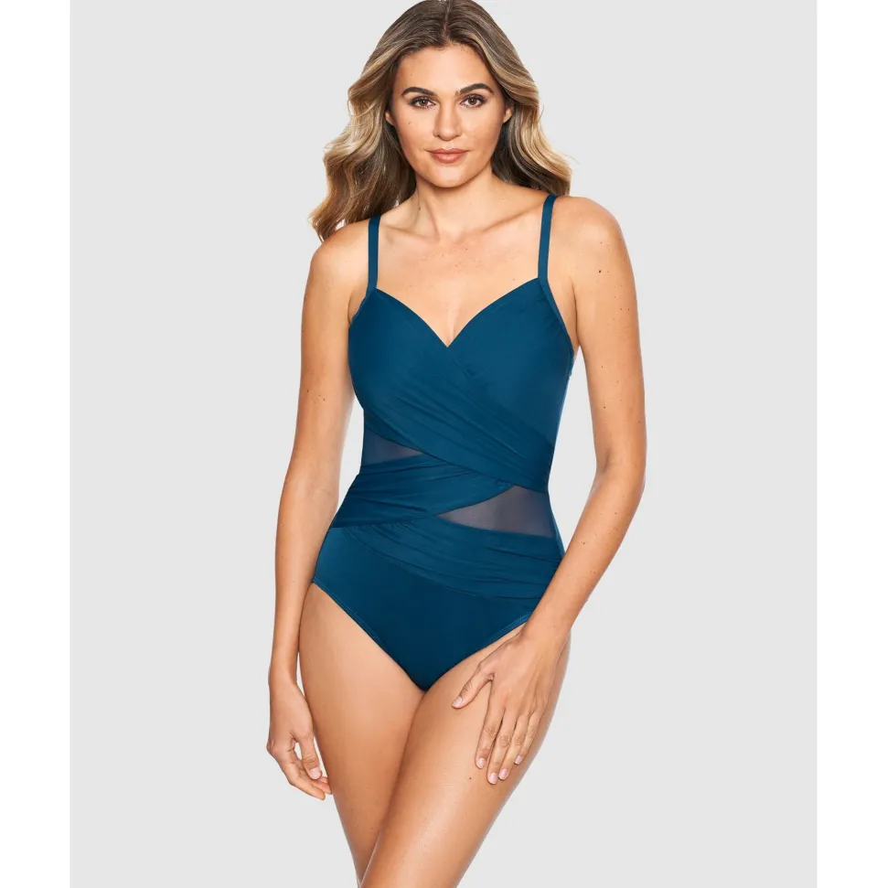 This shaping swimsuit with hidden underwire will nip, tuck and lift your silhouette to perfection. Made from comfy yet ultra-firm Miratex® control fabric for all-over slimming, the clever combination of wrapover draping and sheer mesh inserts also creates the illusion of a smaller waistline.