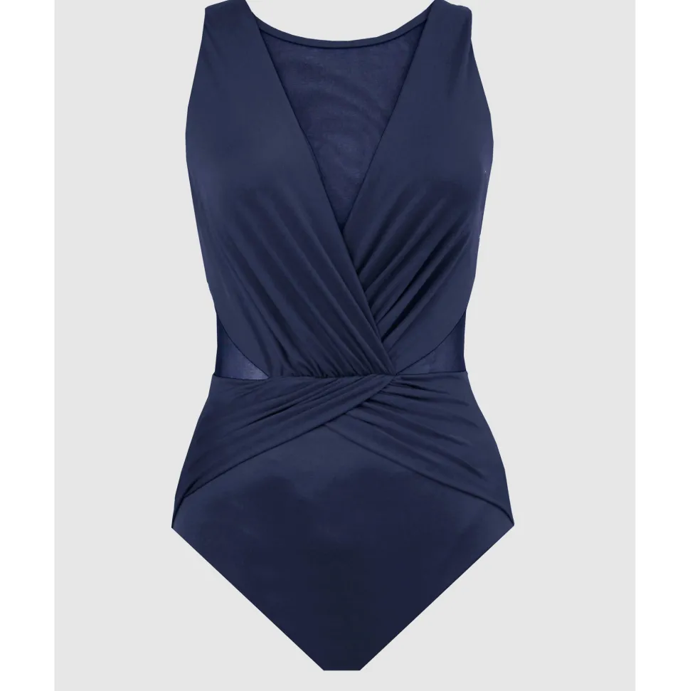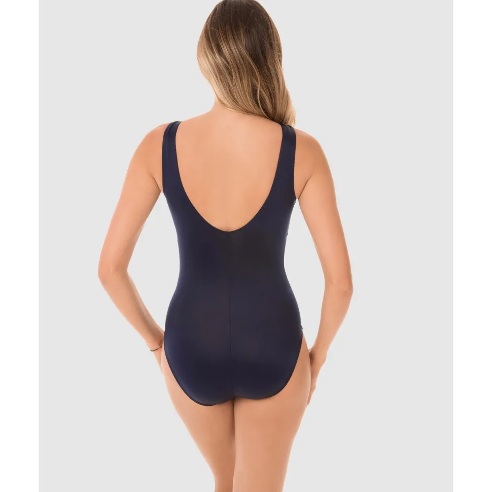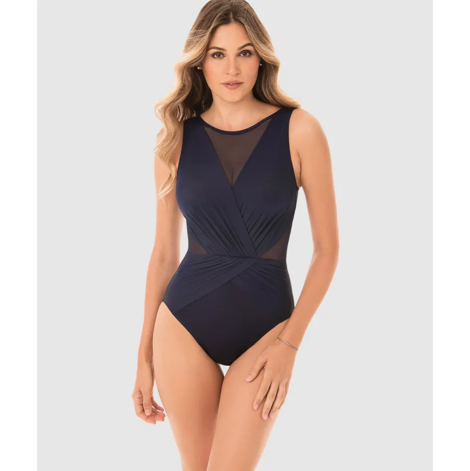 Cut a sleek figure on the beach in this one-piece swimsuit with high neck coverage and built-in shaping. Miraclesuit’s powerful Miratex fabric provides all-over body control for a smoother look, while clever waistline gathering and triangular mesh panels create an instant hourglass look. Choose this slimming bathing suit when you want wirefree comfort, flattering figure-control, and maximum coverage at the neckline.