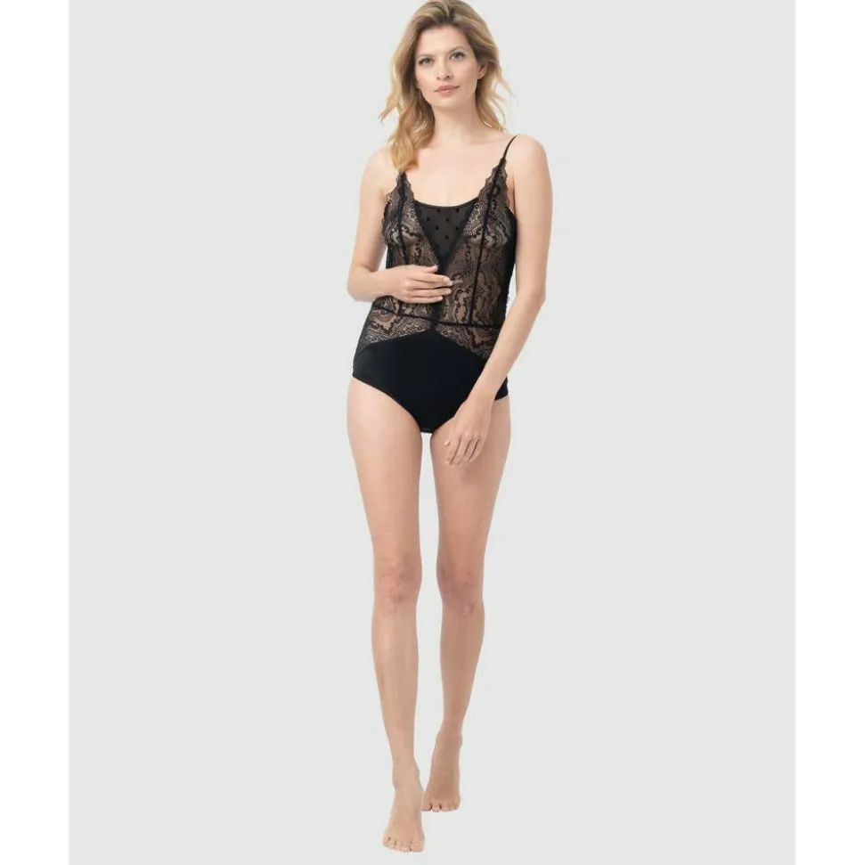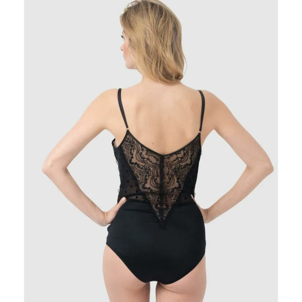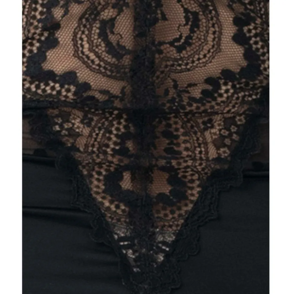 Strike a mesmerising figure in the intricately-detailed Patchwork Lace Bodysuit by Oh!Zuza, which is carefully pieced together from alternating panels of lace, polkadot mesh, and smooth opaque fabric. At the back, an extra-long insert of sheer lace sweeps down your spine, elongating your figure and enhancing your curves.