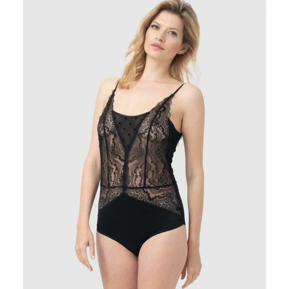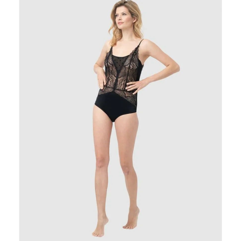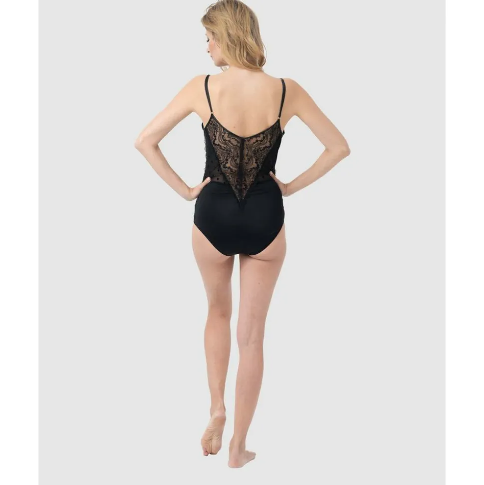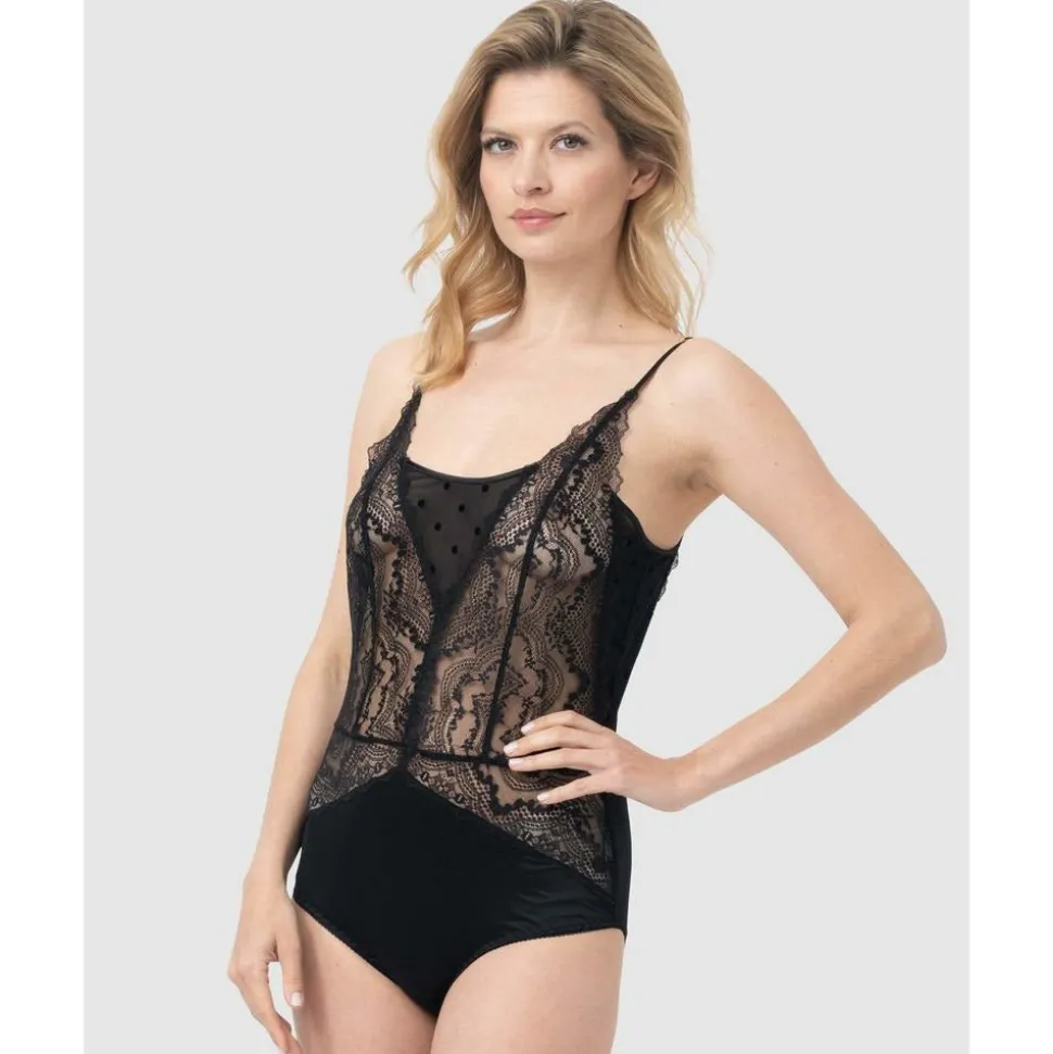 Strike a mesmerising figure in the intricately-detailed Patchwork Lace Bodysuit by Oh!Zuza, which is carefully pieced together from alternating panels of lace, polkadot mesh, and smooth opaque fabric. At the back, an extra-long insert of sheer lace sweeps down your spine, elongating your figure and enhancing your curves.