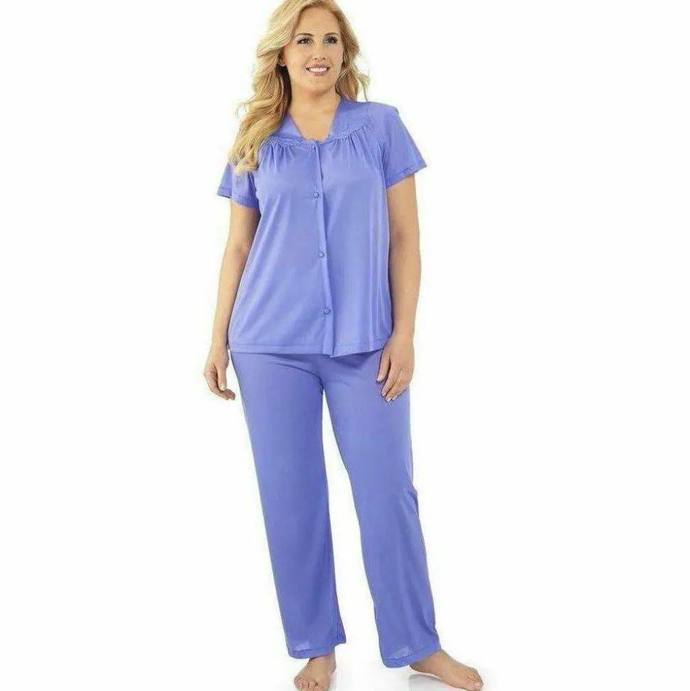 This short sleeve pyjama set is made from soft, silky and exceptionally-breathable nylon tricot-knit fabric, so you can sleep or lounge in total comfort. Part of the Exquisite Form Coloratura collection, these nylon plus size pyjamas feature a button-up top with short sleeves, and long-leg pyjama bottoms with a comfy, covered elastic waistband. Satin-finish trims at the neck and hems add a pretty touch, along with gathered pleats and floral embroidered appliqués.
