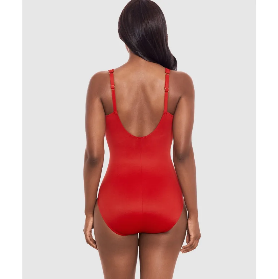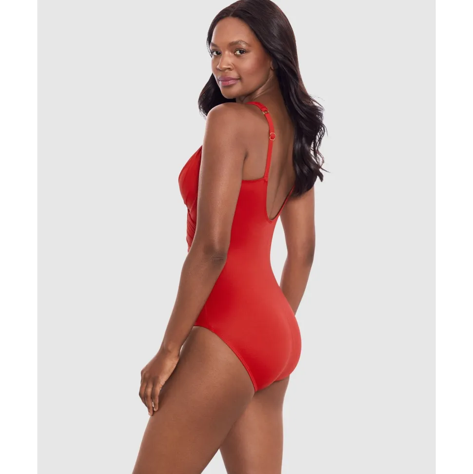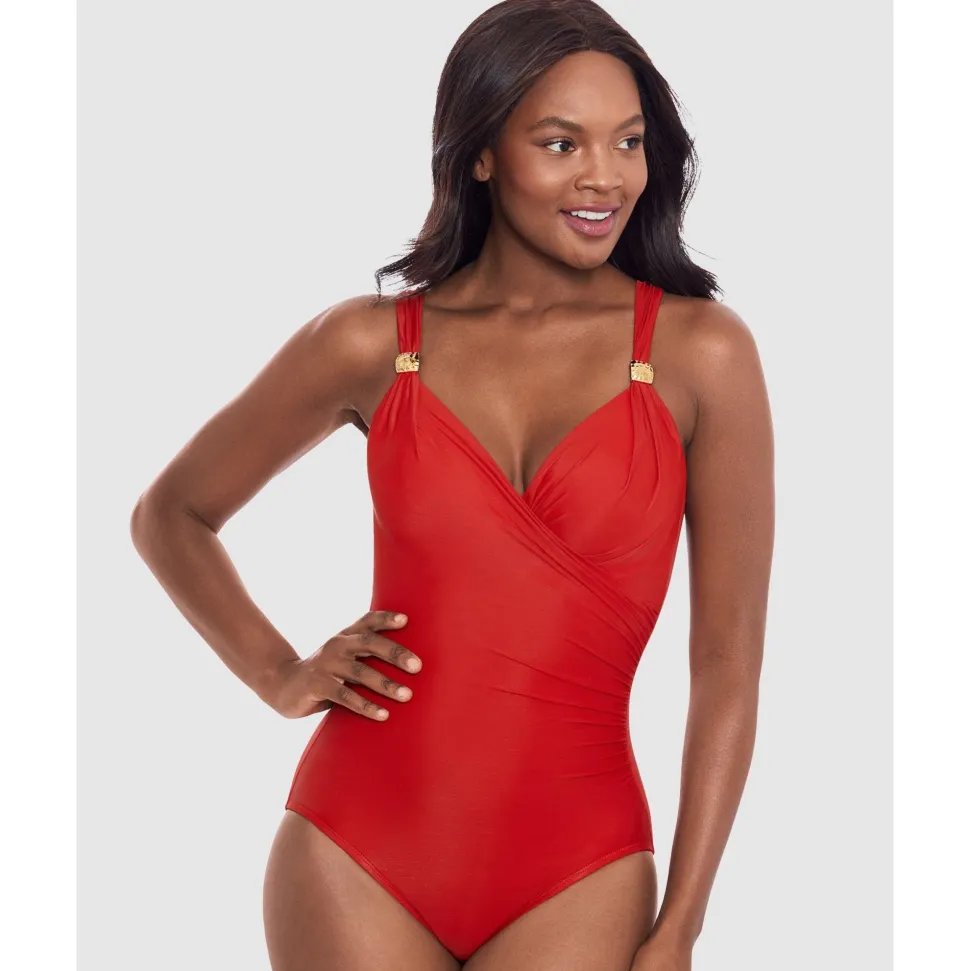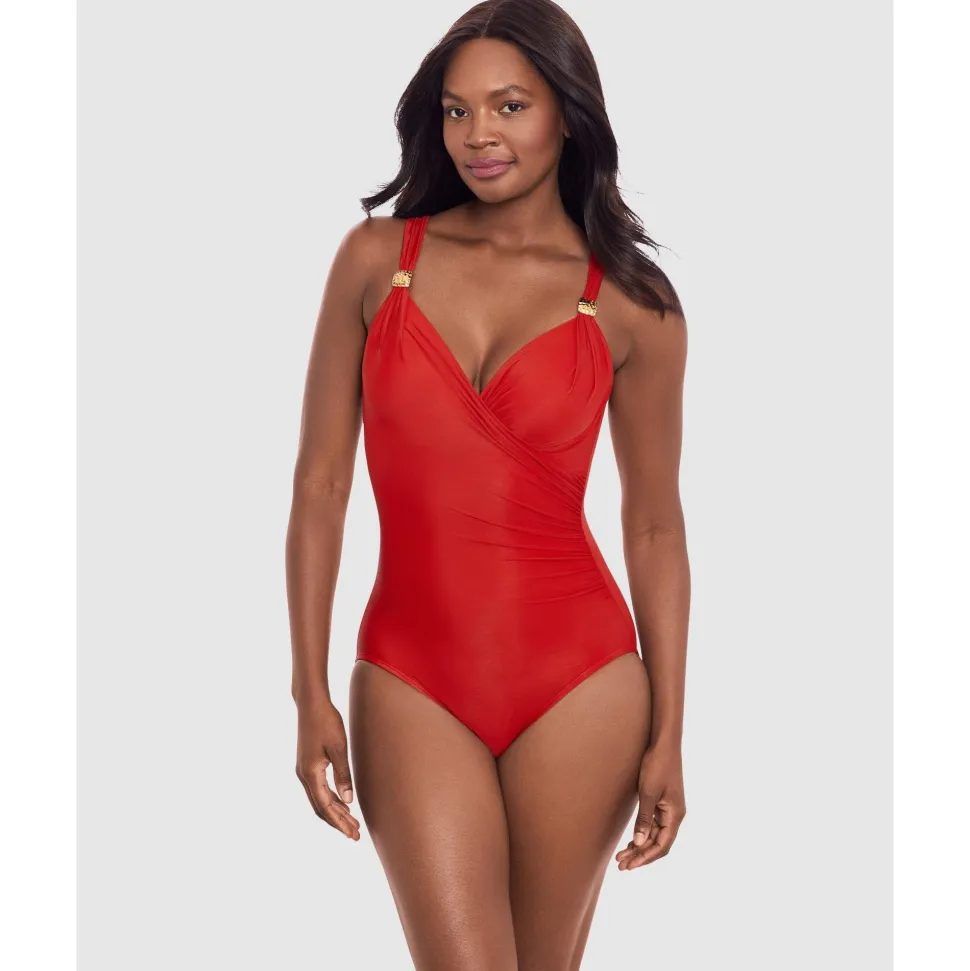 This one-piece swimsuit cleverly molds hourglass curves, so you can feel more confident than ever by the water. A single-layer of Miratex fabric provides all the body-smoothing and tummy-flattering control you need without added shaping panels, while a crossover neckline and subtle draping detail creates the illusion of a smaller waistline. This slimming, shaping swimsuit also features foam cup lining and hidden underwires for lift and support.