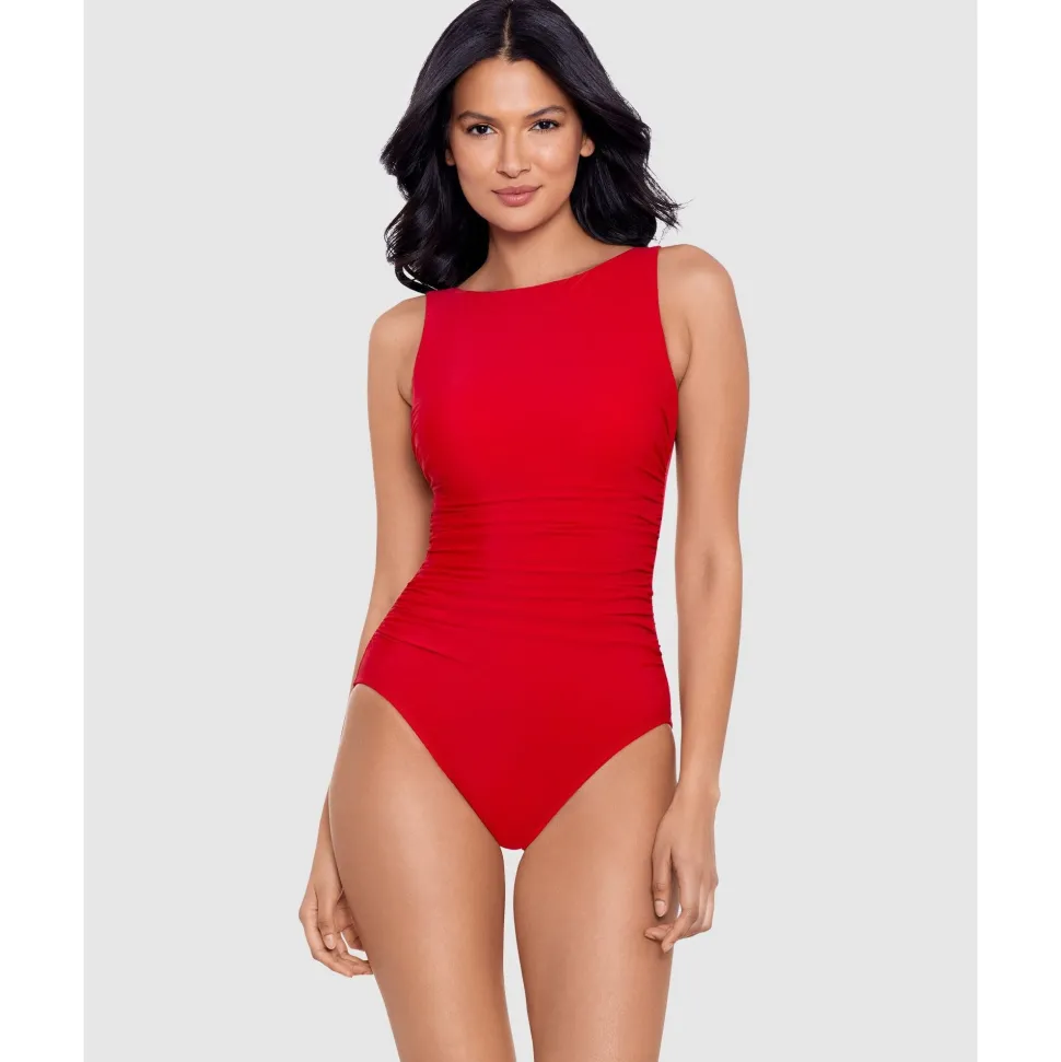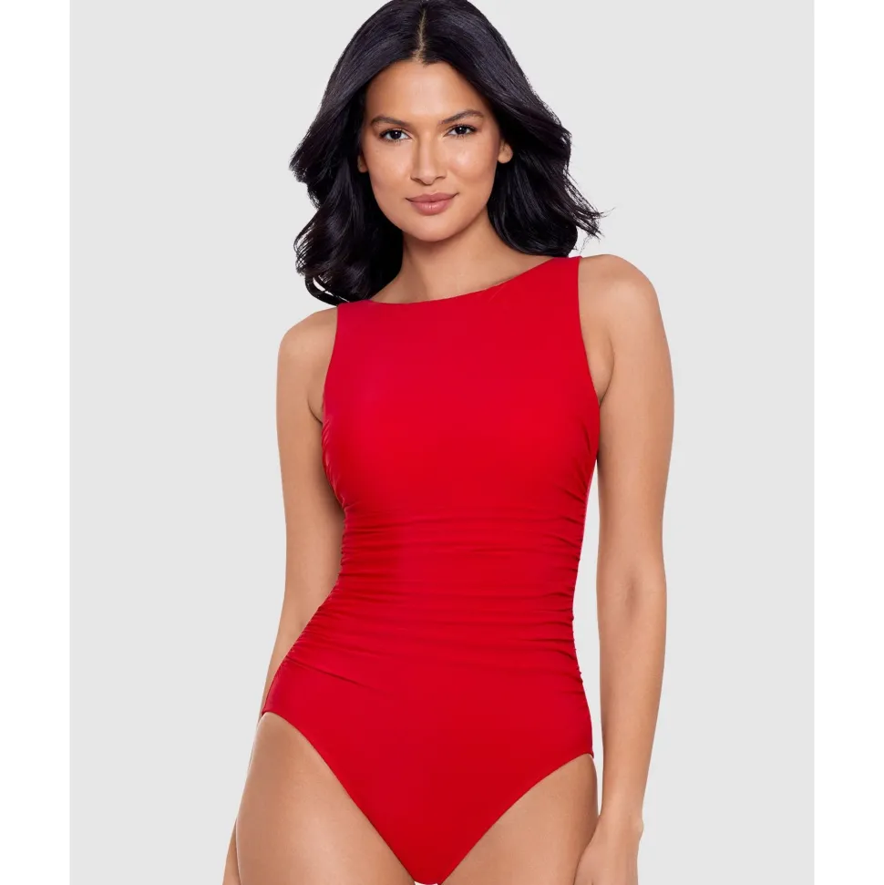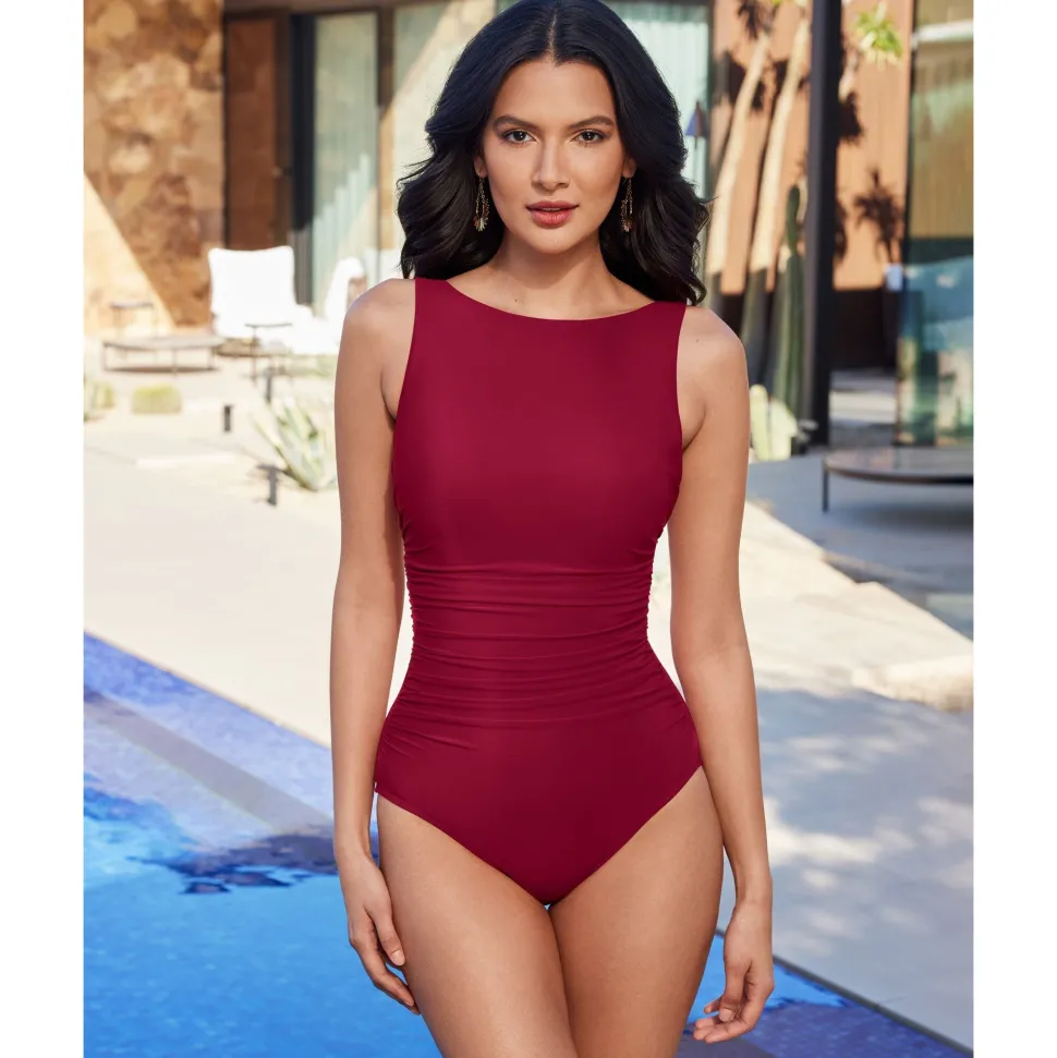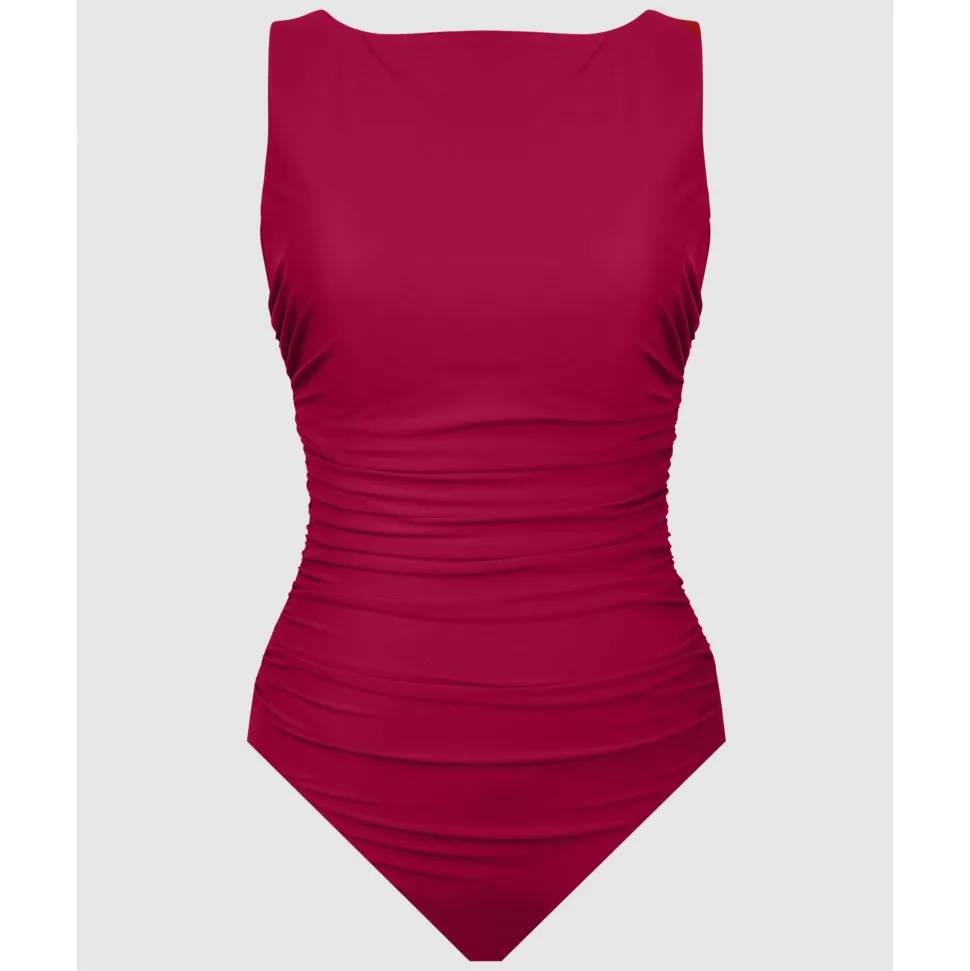 Cut a sleek and elegant figure in this minimalist shaping swimsuit, which features an extra high neckline at the front but still shows a flash of skin via the scooped back. The ruched swimsuit design subtly disguises any tummy worries, while the high-powered shapewear fabric takes inches off from every angle.