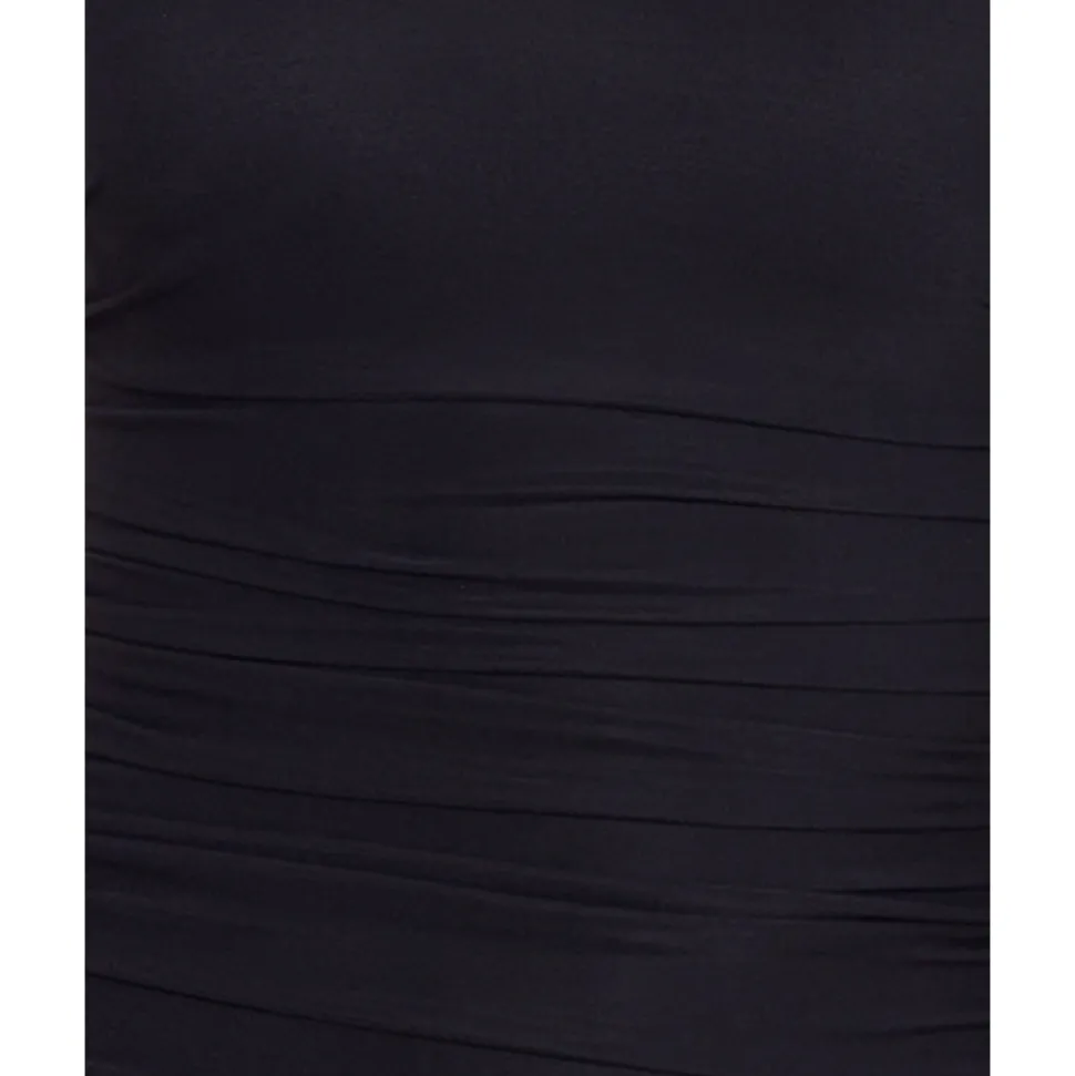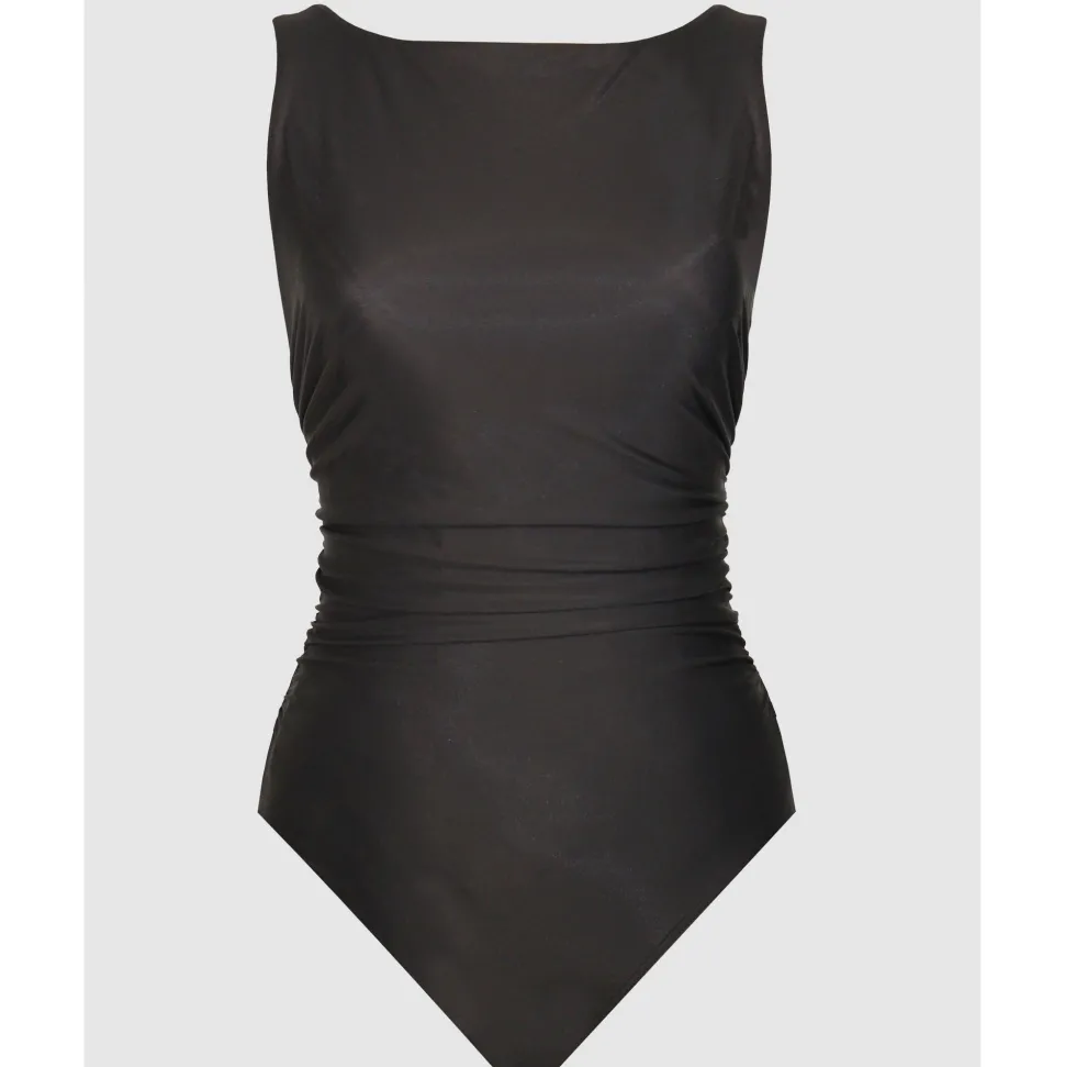 Cut a sleek and elegant figure in this minimalist shaping swimsuit, which features an extra high neckline at the front but still shows a flash of skin via the scooped back. The ruched swimsuit design subtly disguises any tummy worries, while the high-powered shapewear fabric takes inches off from every angle.