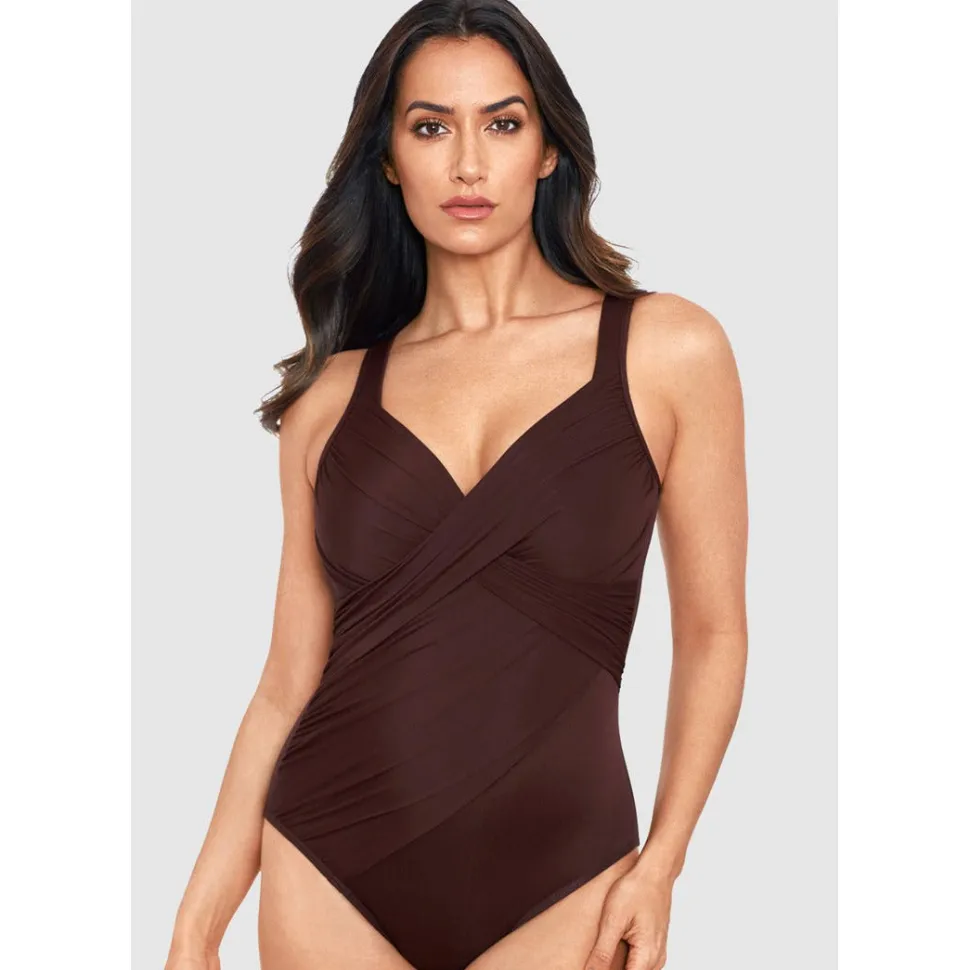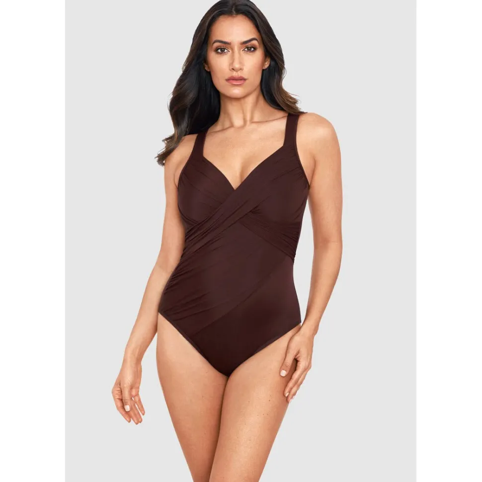 This one-piece shaping swimsuit will reveal curves you never knew you had! With a crossover neckline that leads into tummy-flattering draping, this slimming bathing suit sculpts the illusion of an hourglass figure while also providing all-over smoothing via Miraclesuit’s unique Miratex fabric. Hidden away inside are underwired, foam-lined cups, so your cleavage will get a confidence-inspiring boost too!