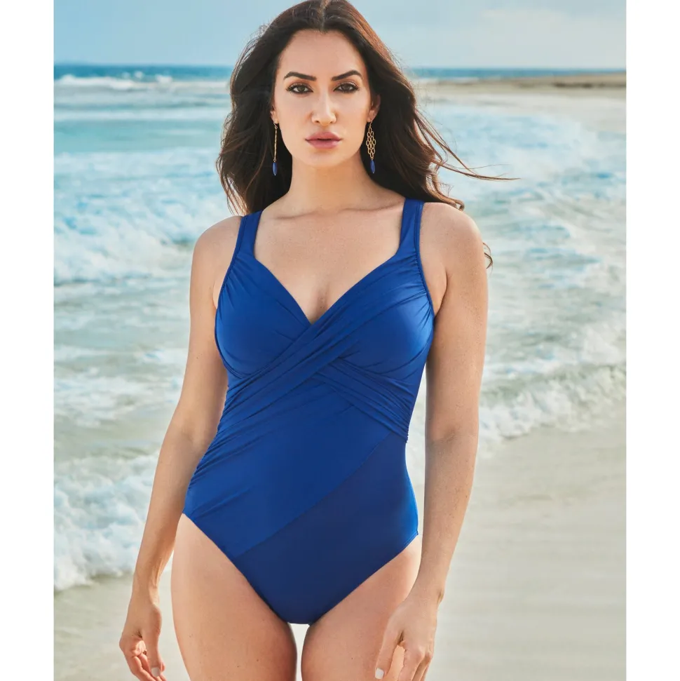 This one-piece shaping swimsuit will reveal curves you never knew you had! With a crossover neckline that leads into tummy-flattering draping, this slimming bathing suit sculpts the illusion of an hourglass figure while also providing all-over smoothing via Miraclesuit’s unique Miratex fabric. Hidden away inside are underwired, foam-lined cups, so your cleavage will get a confidence-inspiring boost too!