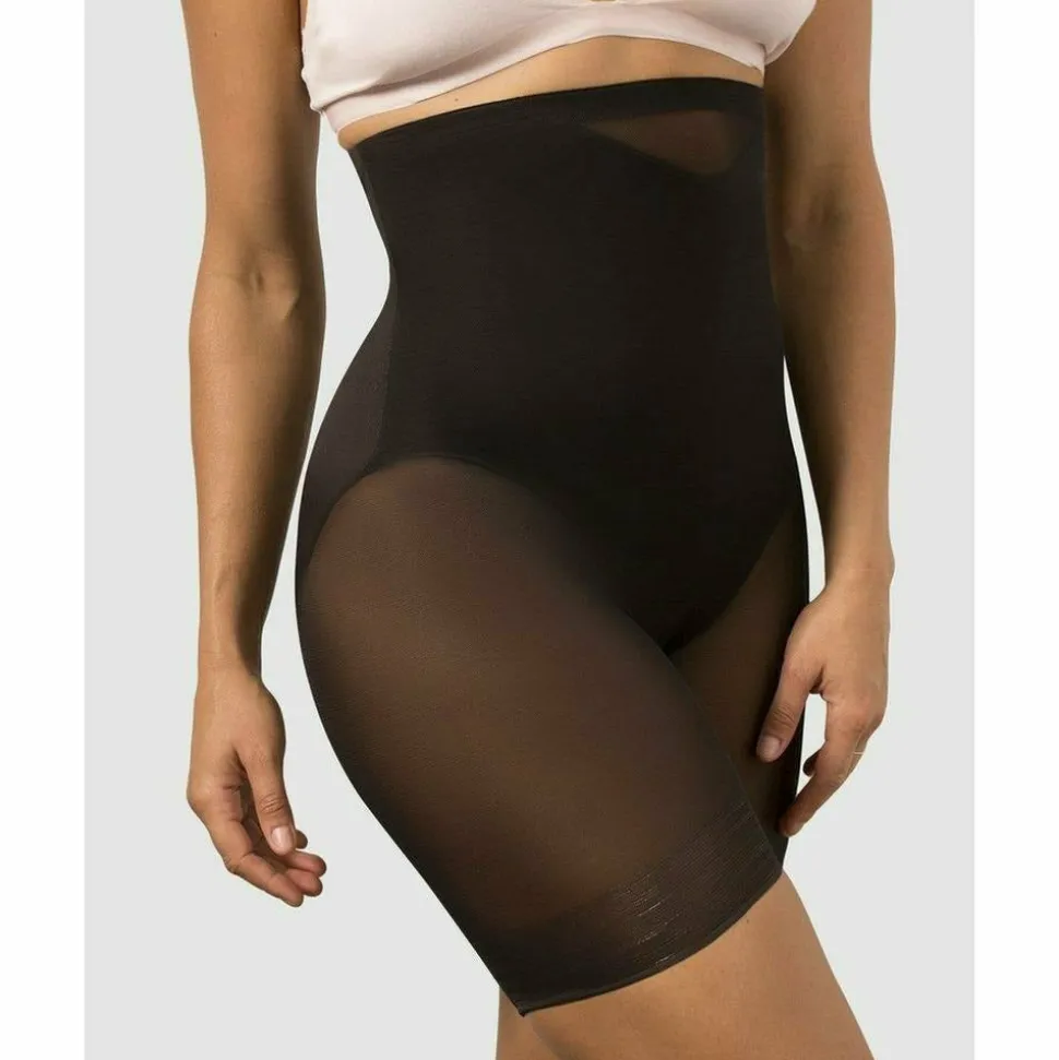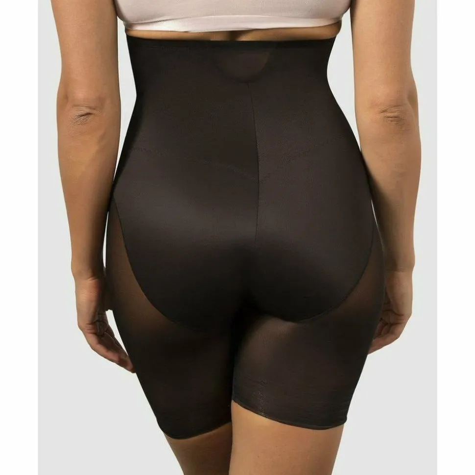 This hi-waist thigh slimmer from MiracleSuit features sexy, sheer paneling which allows the garment to adjust to your body and create a perfect fit. The double panels provide extra firm control and shaping, but maintain a smooth look under your clothes. Choose it to shape your midriff, and slim your tummy, hips, & thighs.