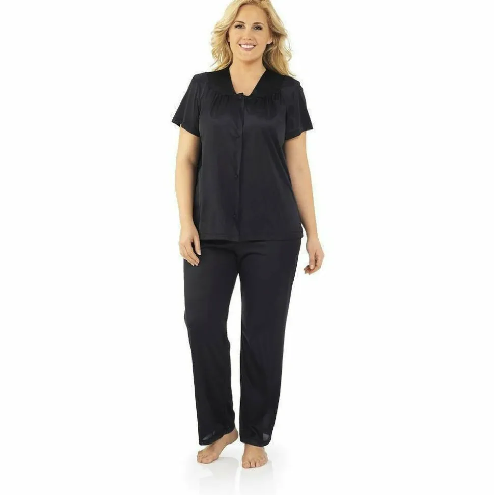 This short sleeve pyjama set is made from soft, silky and exceptionally-breathable nylon tricot-knit fabric, so you can sleep or lounge in total comfort. Part of the Exquisite Form Coloratura collection, these nylon pyjamas feature a button-up top with short sleeves, and long-leg pyjama bottoms with a comfy, covered elastic waistband. Satin-finish trims at the neck and hems add a pretty touch, along with gathered pleats and floral embroidered appliqués.