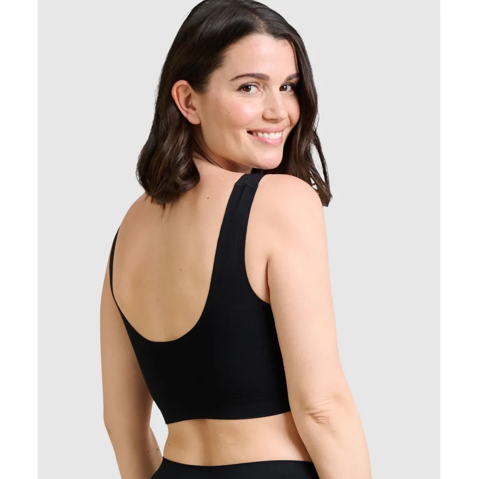 A wirefree bralette so comfortable, you’ll forget it’s there! This full-coverage crop top bralette is made from circular-knit stretch fabric for total freedom of movement, and has removable moulded cups for times you want a smoother shape. It’s a completely seamless bralette with wide, non-adjustable straps and no back fastening, so there’s absolutely nothing to rub against and irritate your skin – just soft, smooth, wireless comfort that supports up to a DD cup.