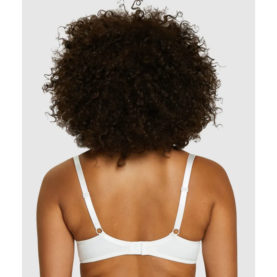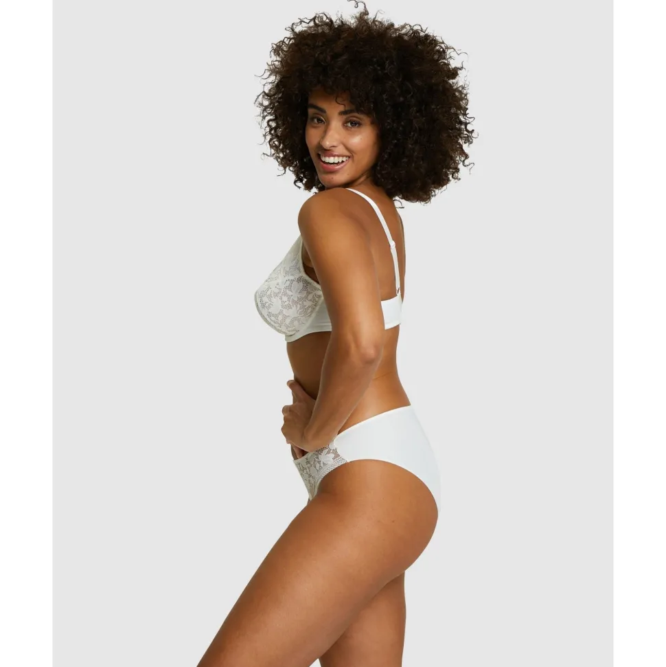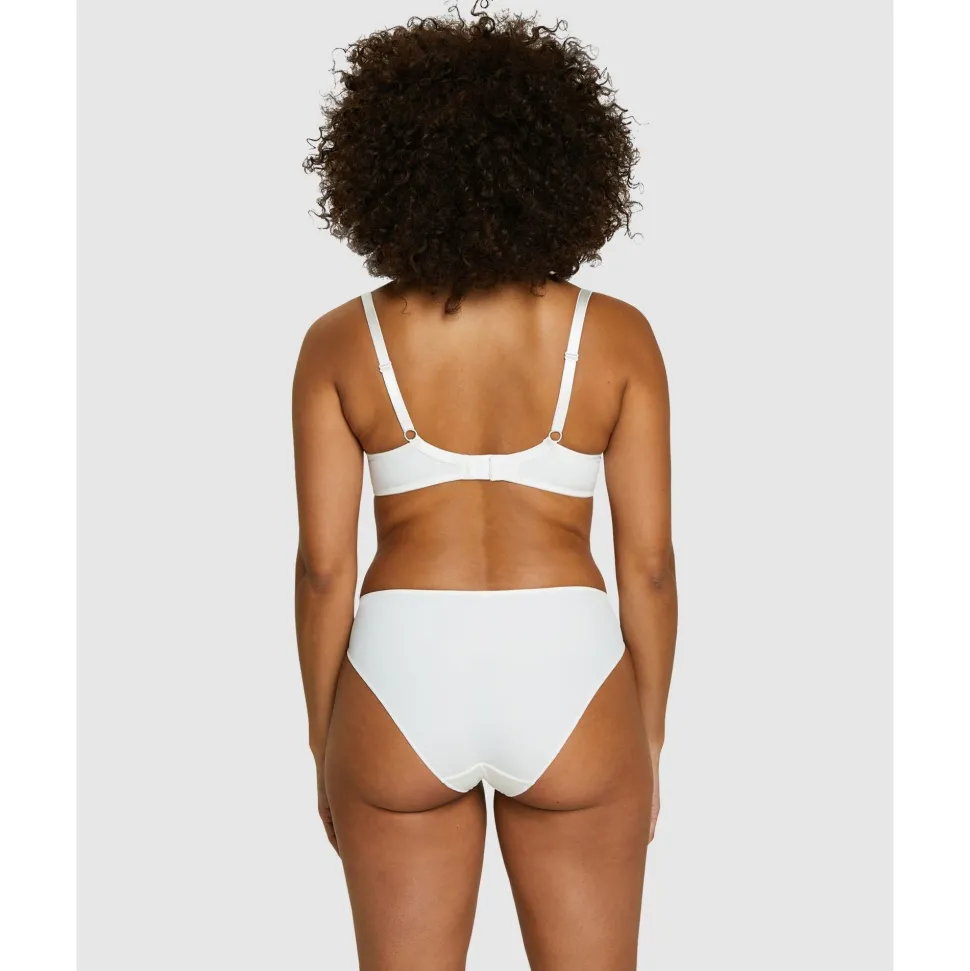 Offering a supportive full cup fit with a modern and feminine look, this semi-sheer lace bra is also a sustainable lingerie options thanks to its high recycled fibre content. A slightly low-cut gore (adorned with a gold charm) creates a sexy plunge effect, while the 3 part cup bra design (partially-lined with supportive tulle) creates a lifted, rounded shape with no need for padding.