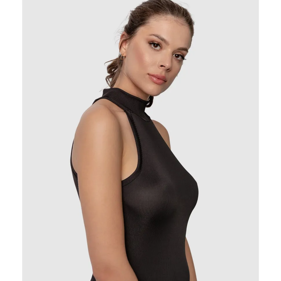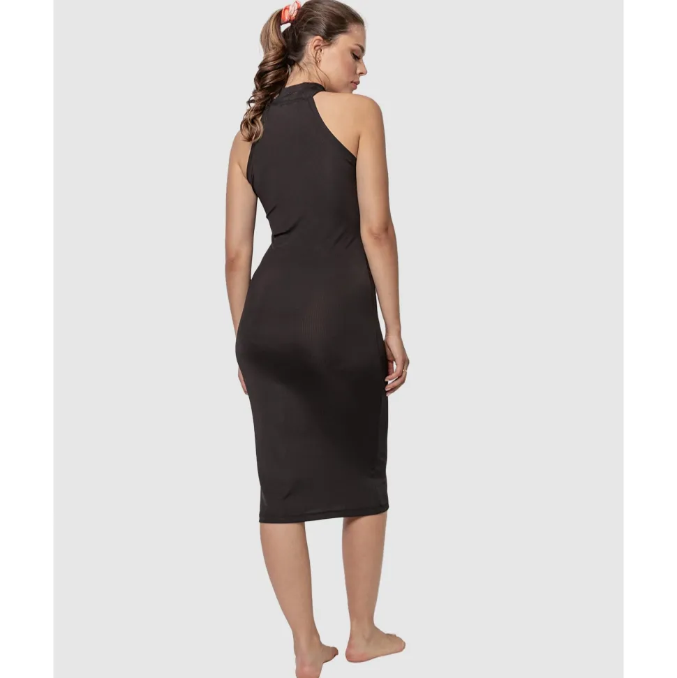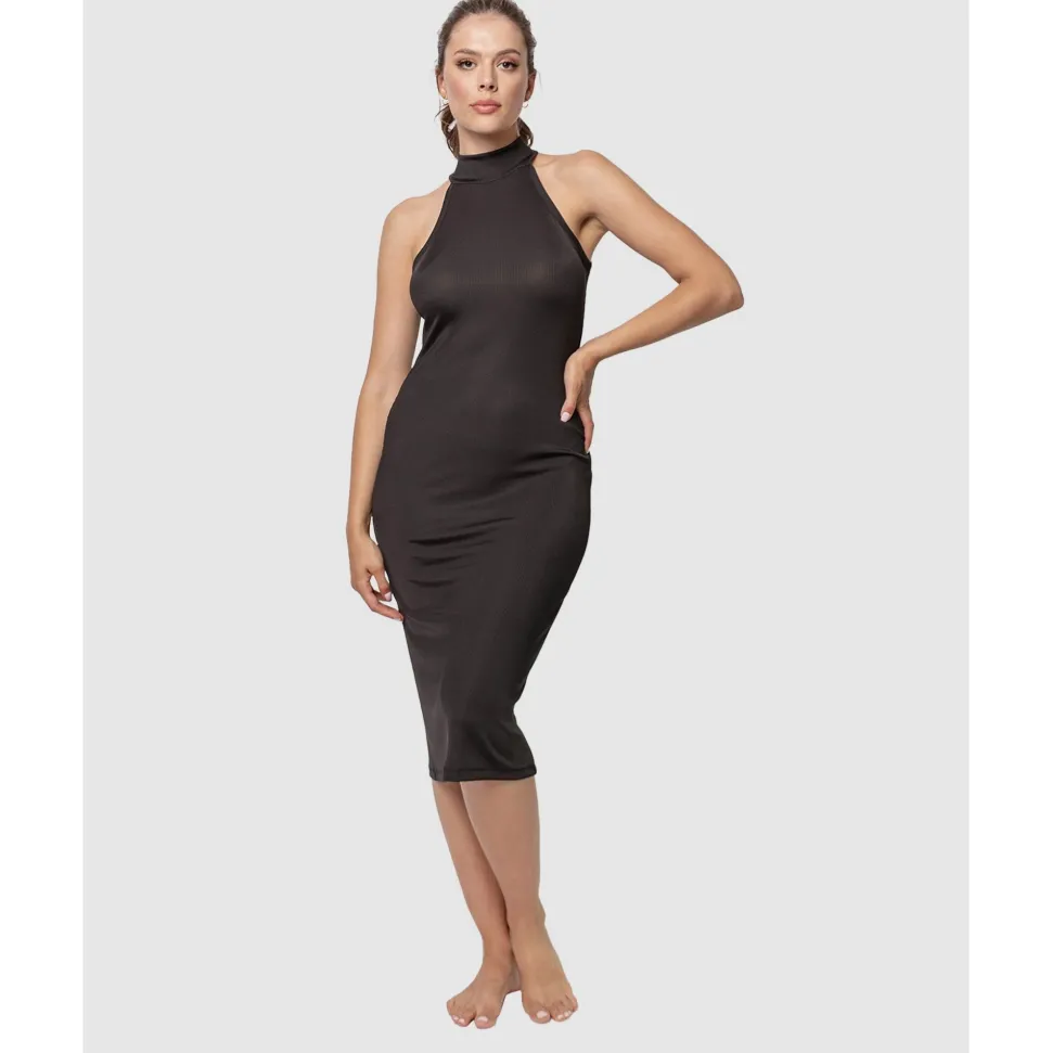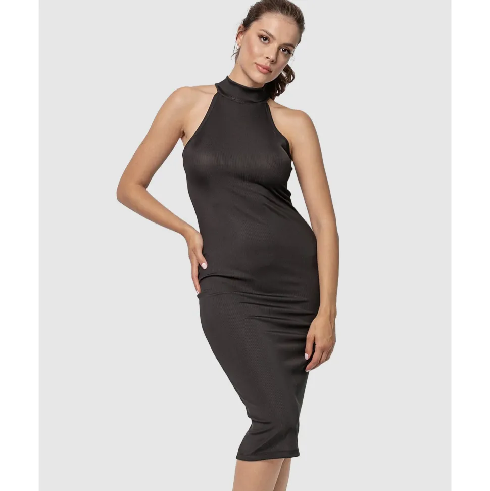 Wear it as a comfy lounge dress or style it up with heels – this midi-length ribbed tube dress is a truly versatile addition to your wardrobe! The ribbed fabric is silky-smooth and contours to your curves without feeling restrictive, while the cutaway shoulders and high turtle neck shape give the impression of a halter neck from the front (while still allowing you to wear a racerback bra for shape and support).