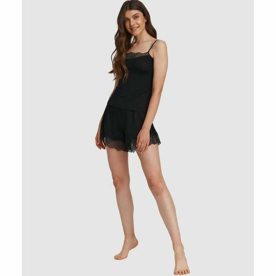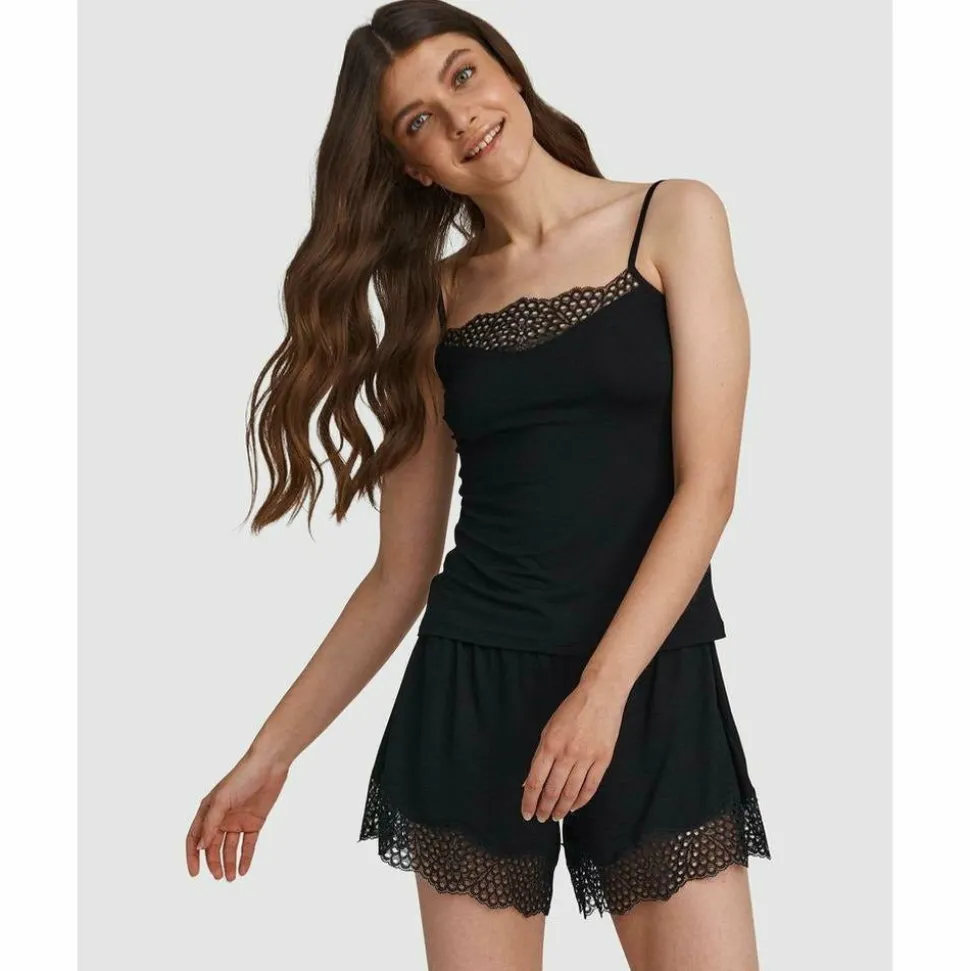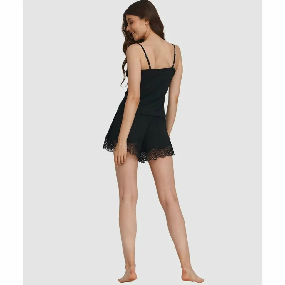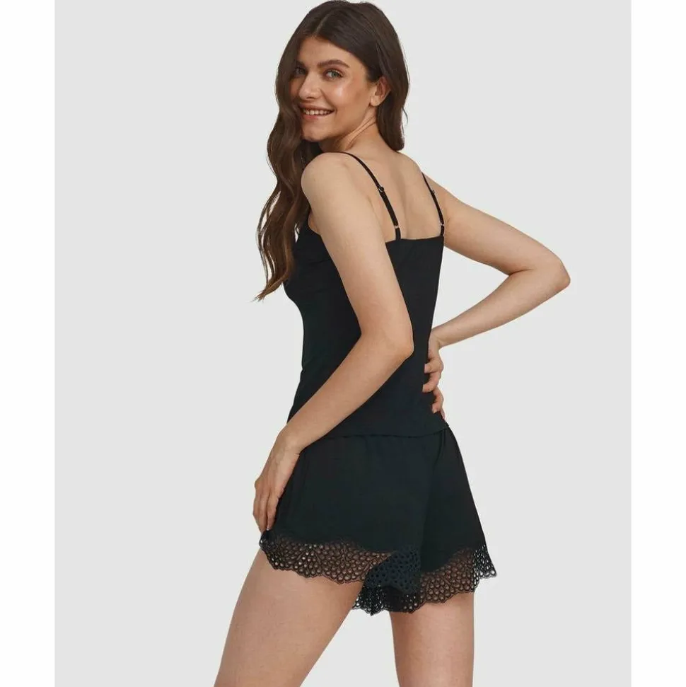 Made in Poland from natural fibre-based, Oeko-Tex certified viscose fabric, this Cami Pyjama Set by Vanilla Night & Day provides comfort and breathability in a stylish package. Thick, snakeskin-inspired lace openwork trims both pieces, elevating this above a simple cami and short sets.